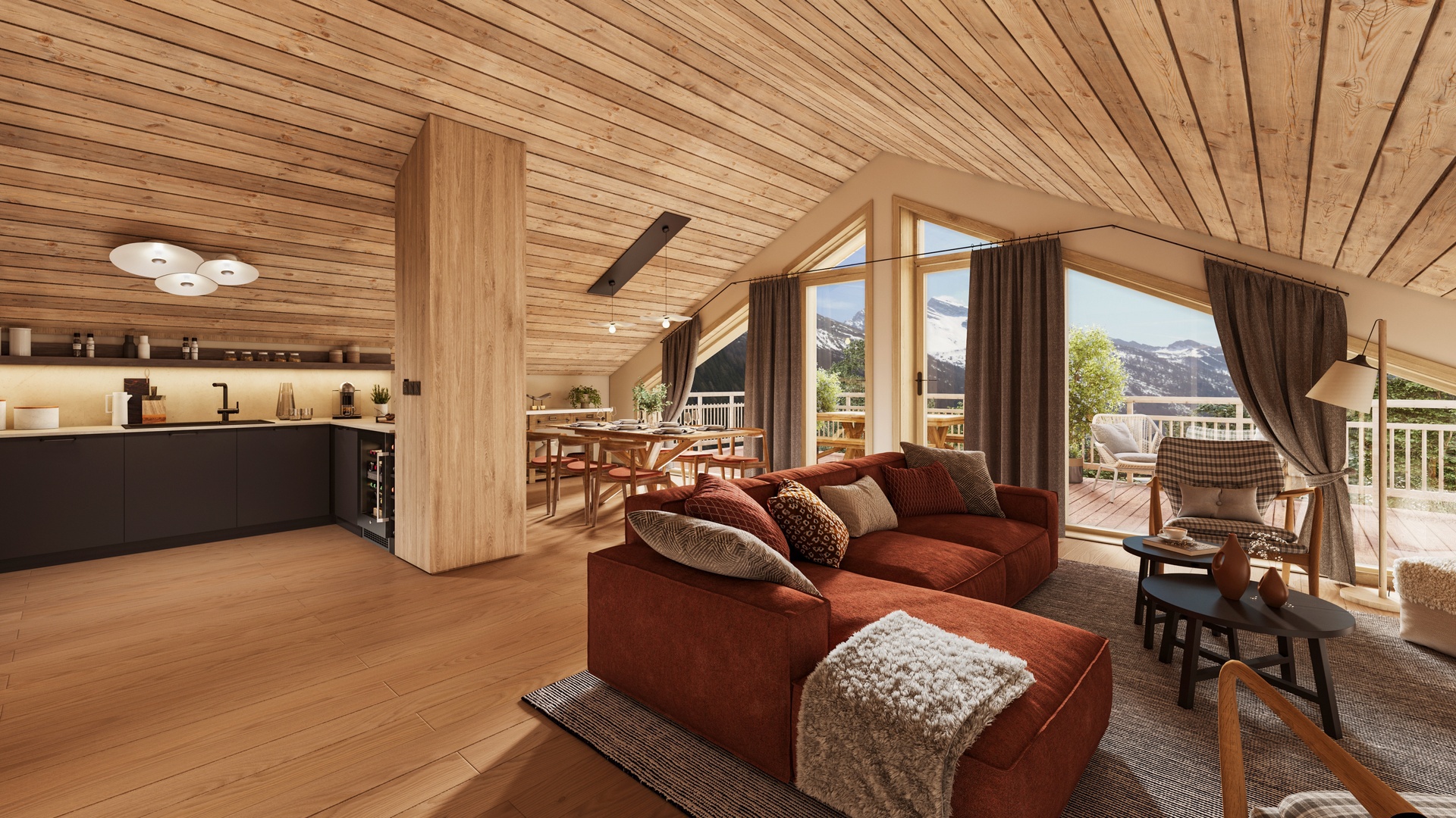 This new development offers a variety of apartment and chalet types. From two to five bedrooms, they have been designed to suit all needs and budgets. All properties have been conceived to feature spacious, airy living spaces, as well as outdoor areas for enjoying the mountain scenery.