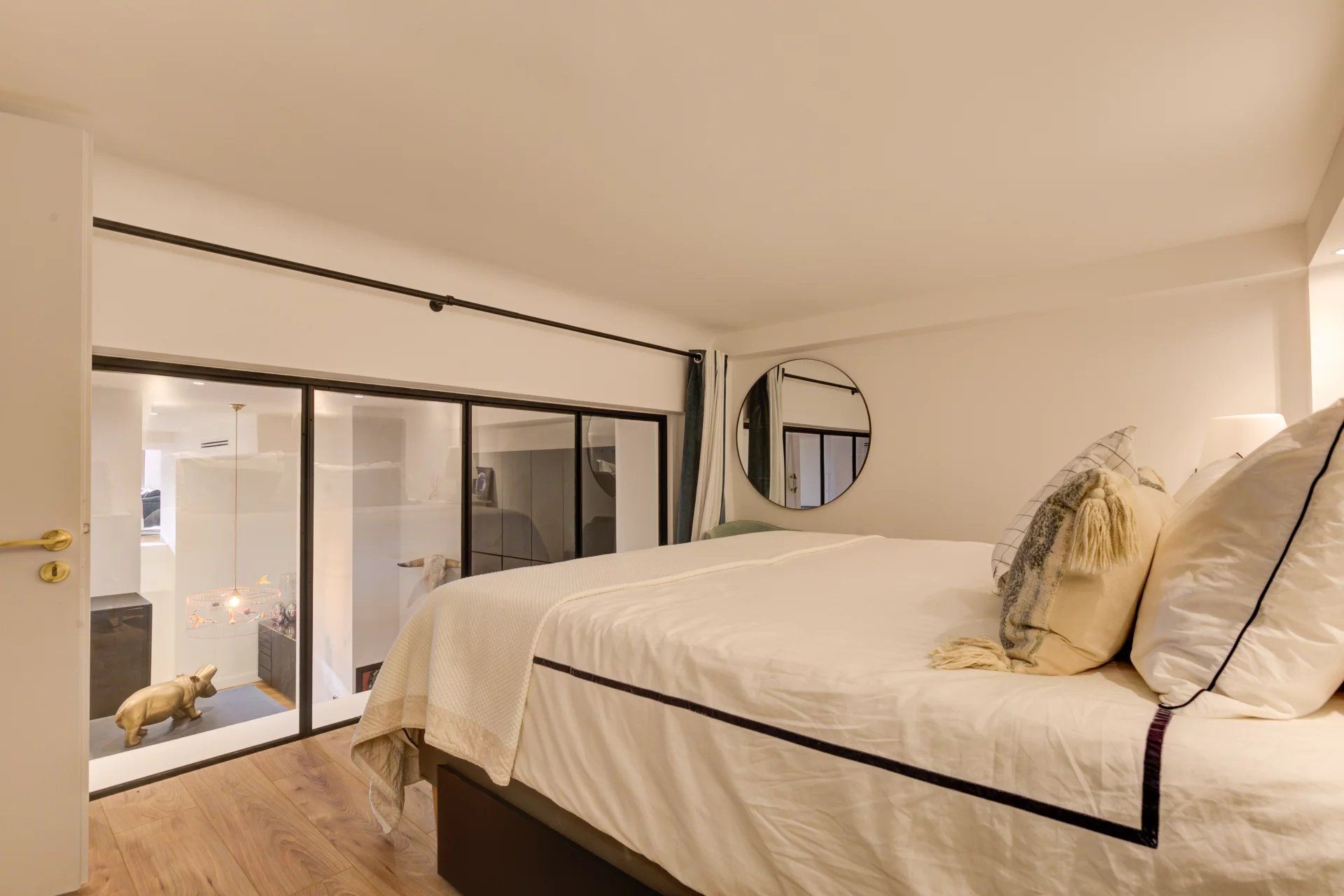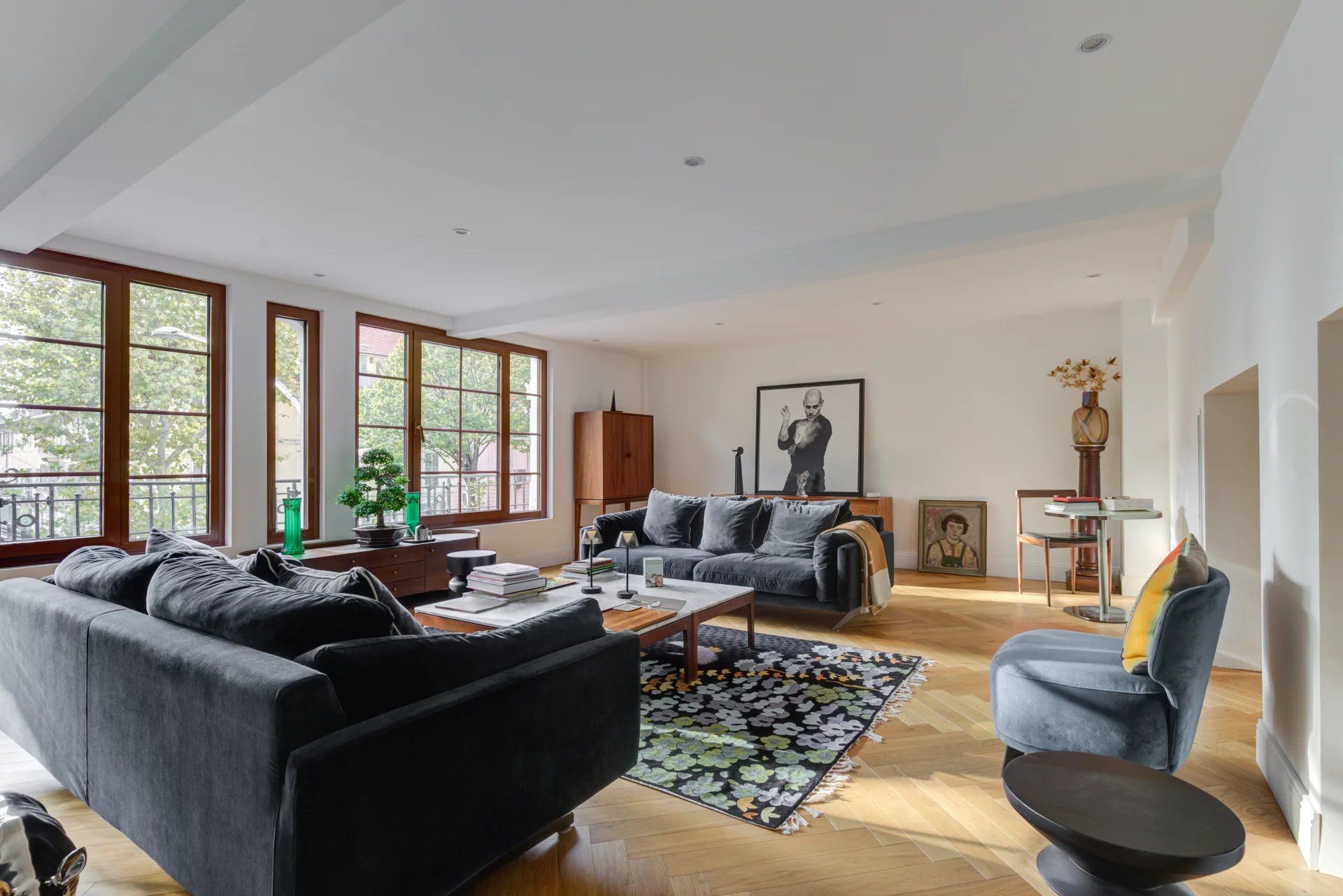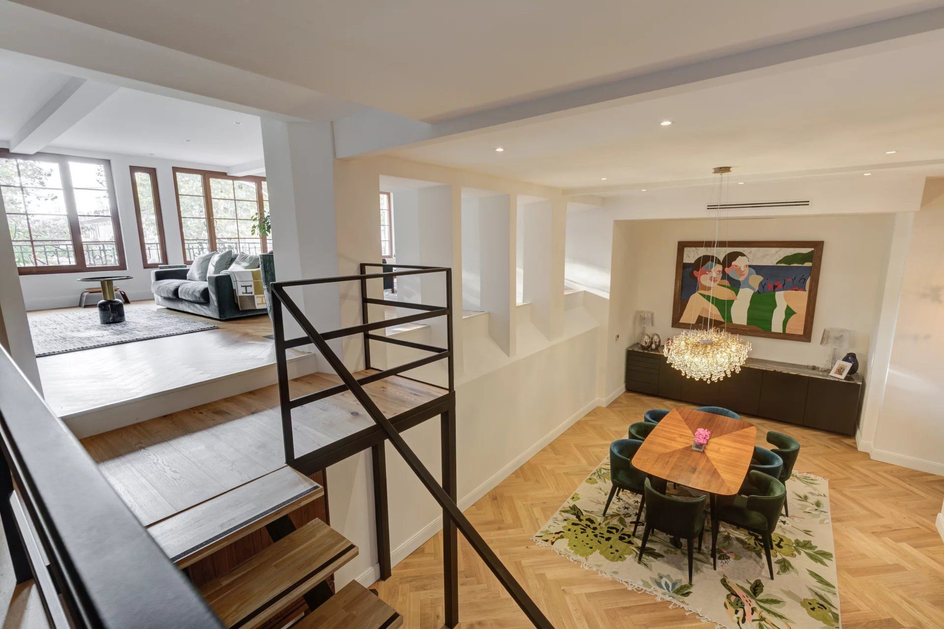 This stunning 215 sq m duplex loft seamlessly blends historical charm with modern luxury. The living space is characterized by soaring high ceilings, elegant hardwood floors, and a contemporary glass atrium that floods the interiors with natural light, creating an atmosphere of sophistication. The fully equipped high-end kitchen features premium materials and state-of-the-art appliances, designed for both style and functionality.