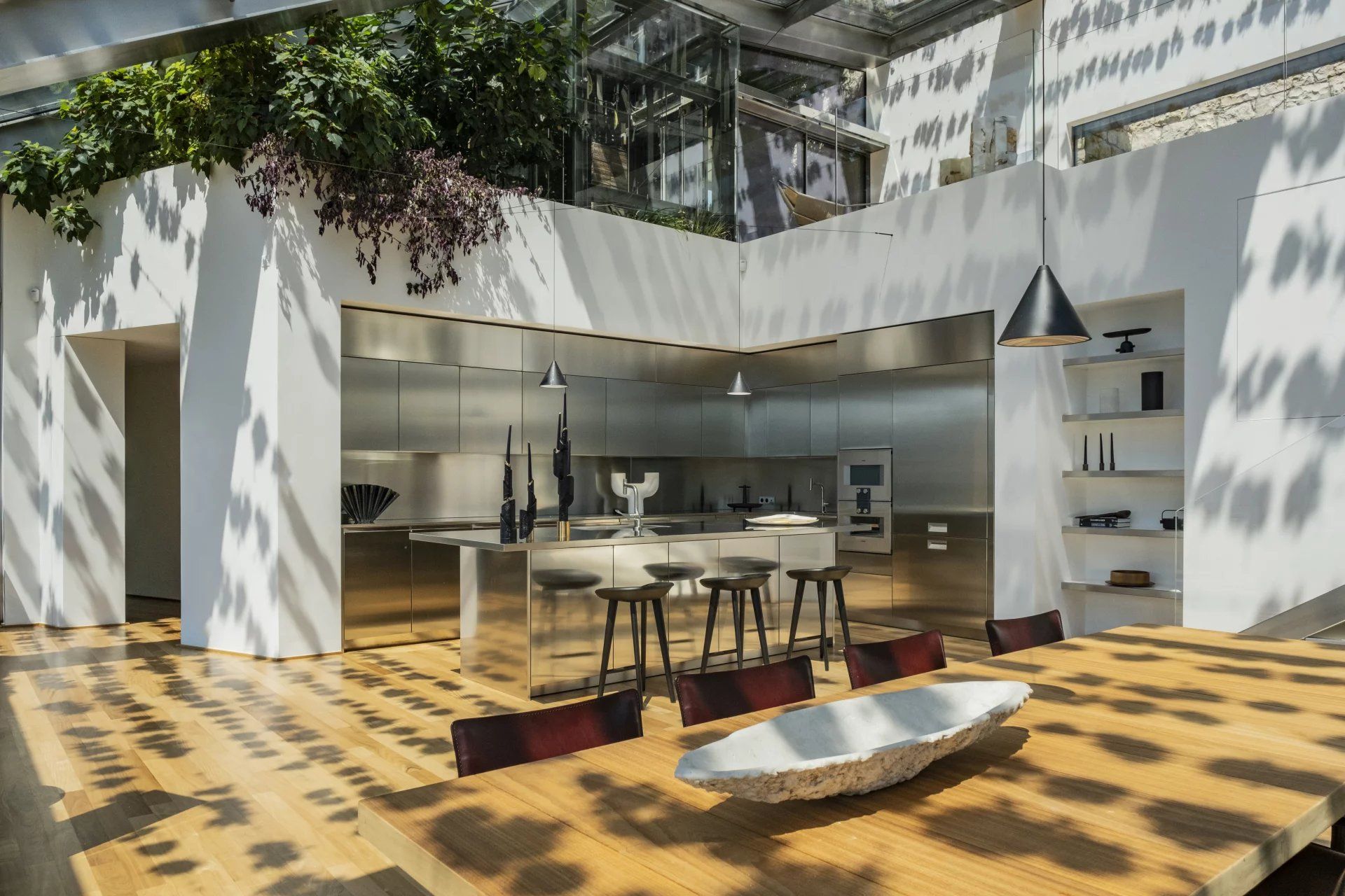 West facing, a series of glass facades provide panoramic views across the Bay of Villefranche, towards Nice and Saint-Tropez; a perfect placement for the dramatic sunsets and skyline of the Côte d’Azur. Intelligent use of steel and glass ensures an open atmosphere, and limited divisional walls ensures the spacious accommodation of nearly 600 sq m flows continuously, whilst intuitive design ensures seamless functionality matched with aesthetics.
