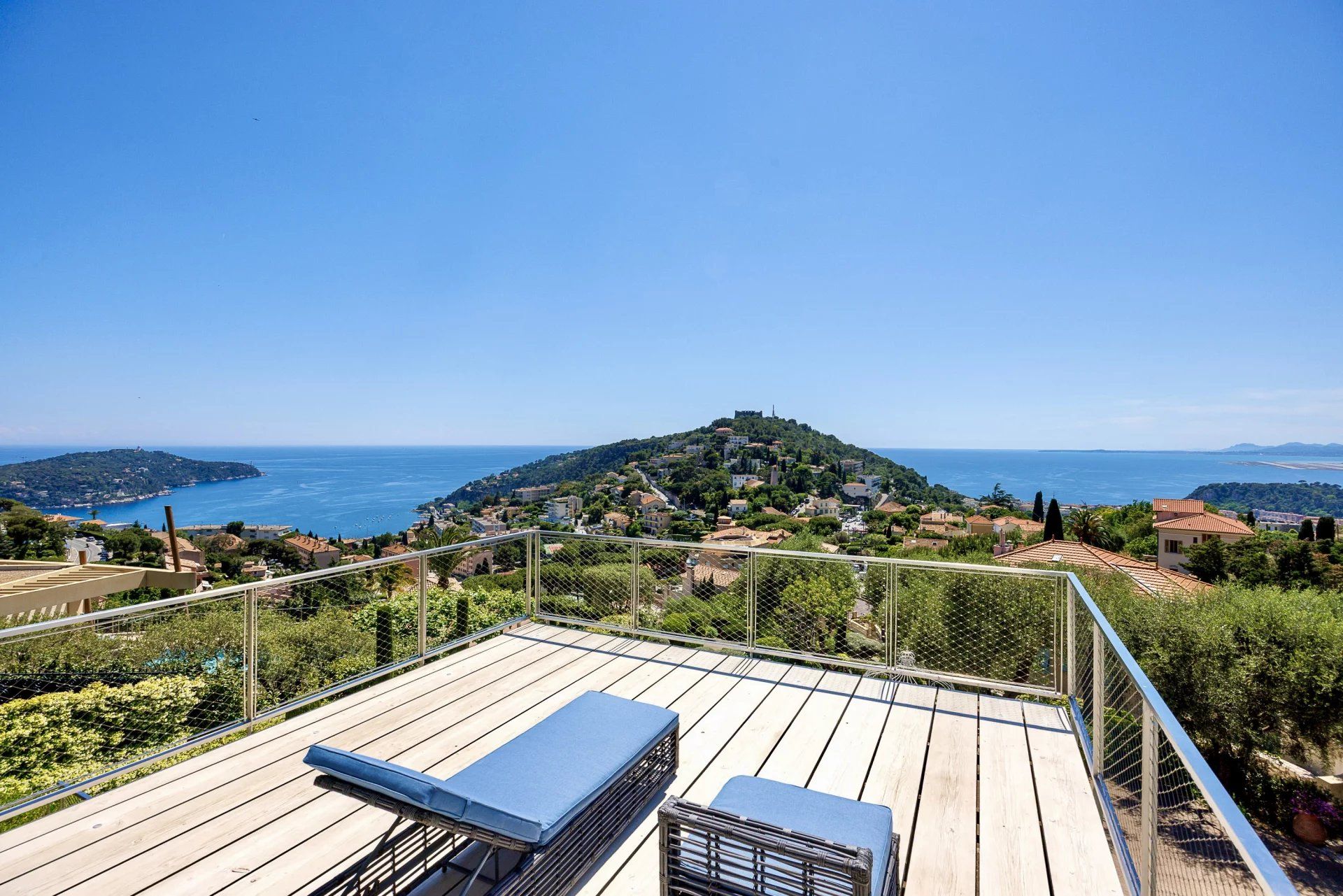 Perched high above Villefranche in a commanding position, this exceptional villa—crafted by a celebrated architect—delivers panoramic views across the Bay of Cap Ferrat, the Bay of Nice, and the distant Esterel mountains.