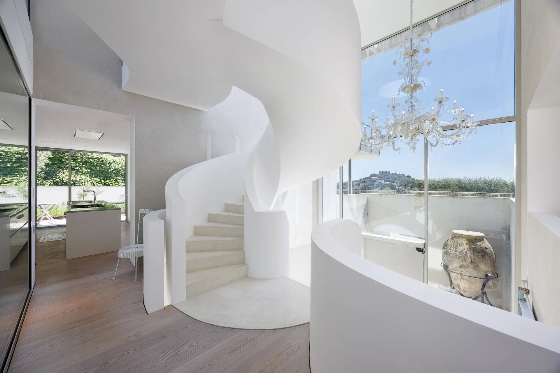 The entrance level features a show-stopping floating spiral staircase leading to the main reception floor, where you’ll find a luminous reception room opening onto a vast terrace with infinity pool, a summer kitchen, and manicured garden. The state-of-the-art kitchen with concealed appliances flows into a formal dining room with an additional outdoor dining space.
