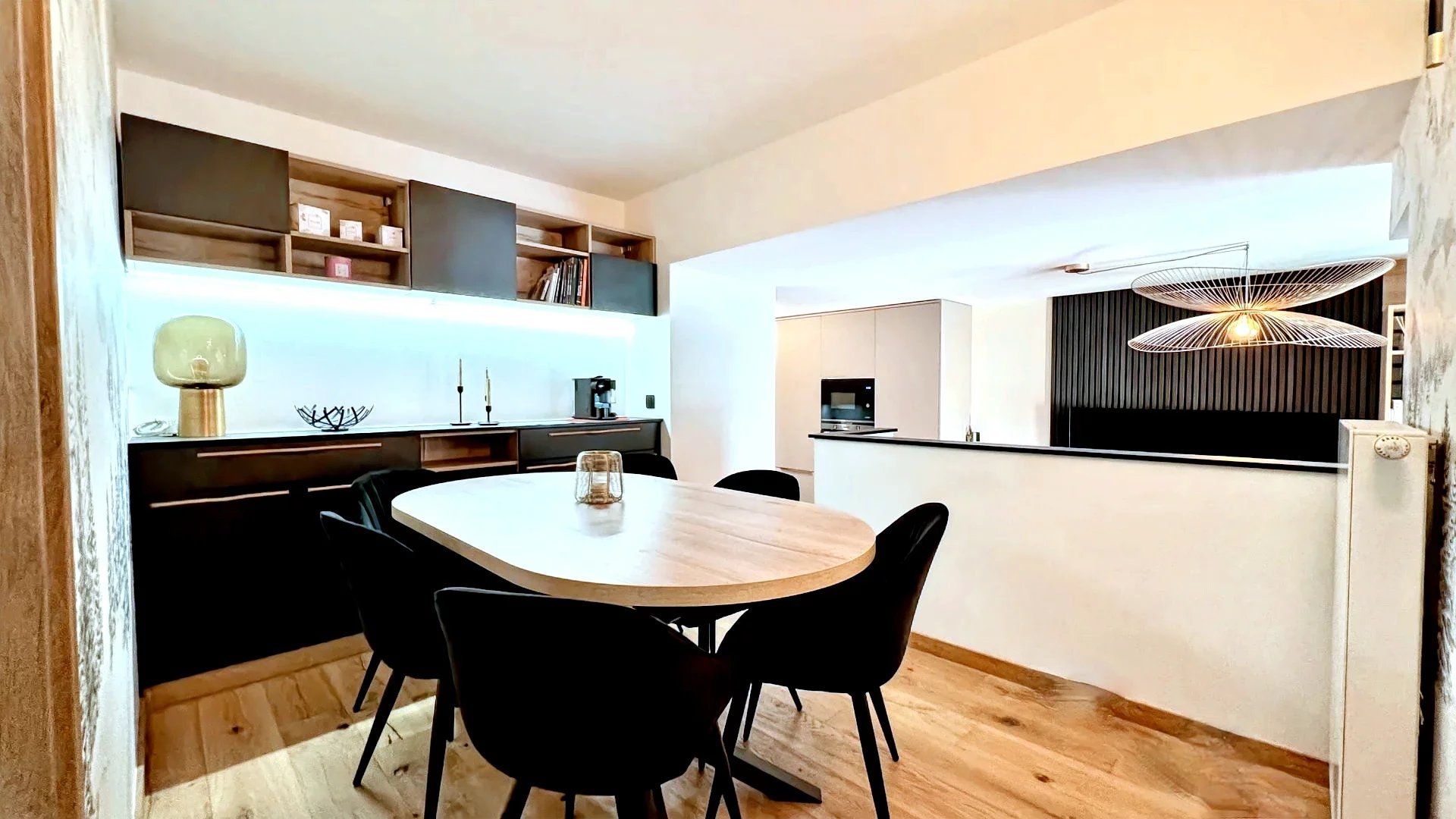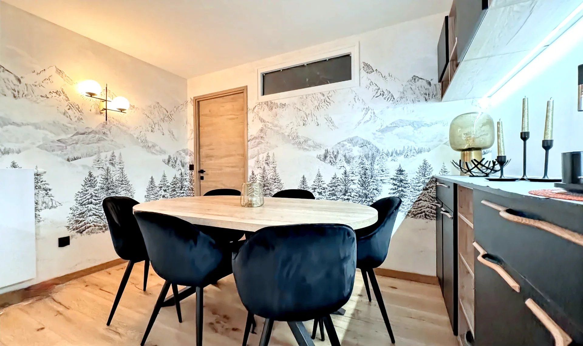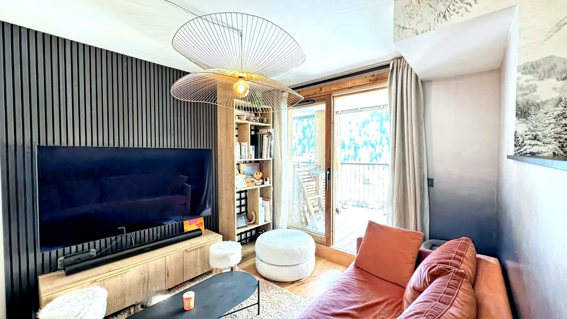 Located on the Domaine de l'Ariondaz in Courchevel Moriond, this superb apartment comprises an entrance hall, a living room opening onto a terrace with mountain views, a lounge area, a dining area and a fully-equipped open-plan kitchen.