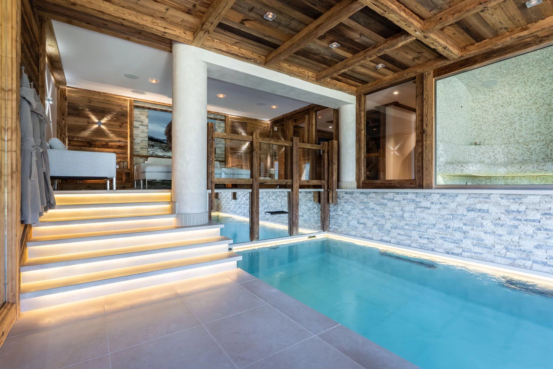 The 134 sq m ground floor features a wellness area and swimming pool with mountain views.