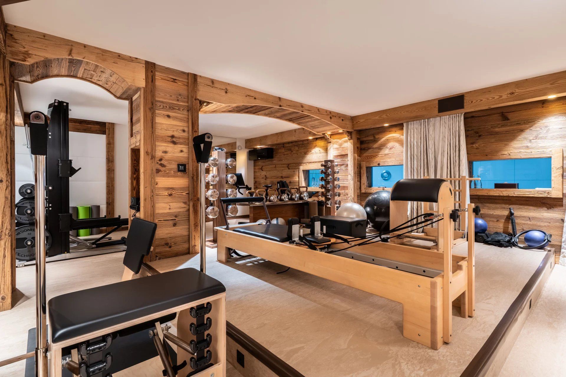 This chalet, with a total surface area of 640 sq m, is arranged over five levels and includes a 155 sq m living space with terrace, balconies and exceptional panoramic views of the surrounding valleys and peaks.