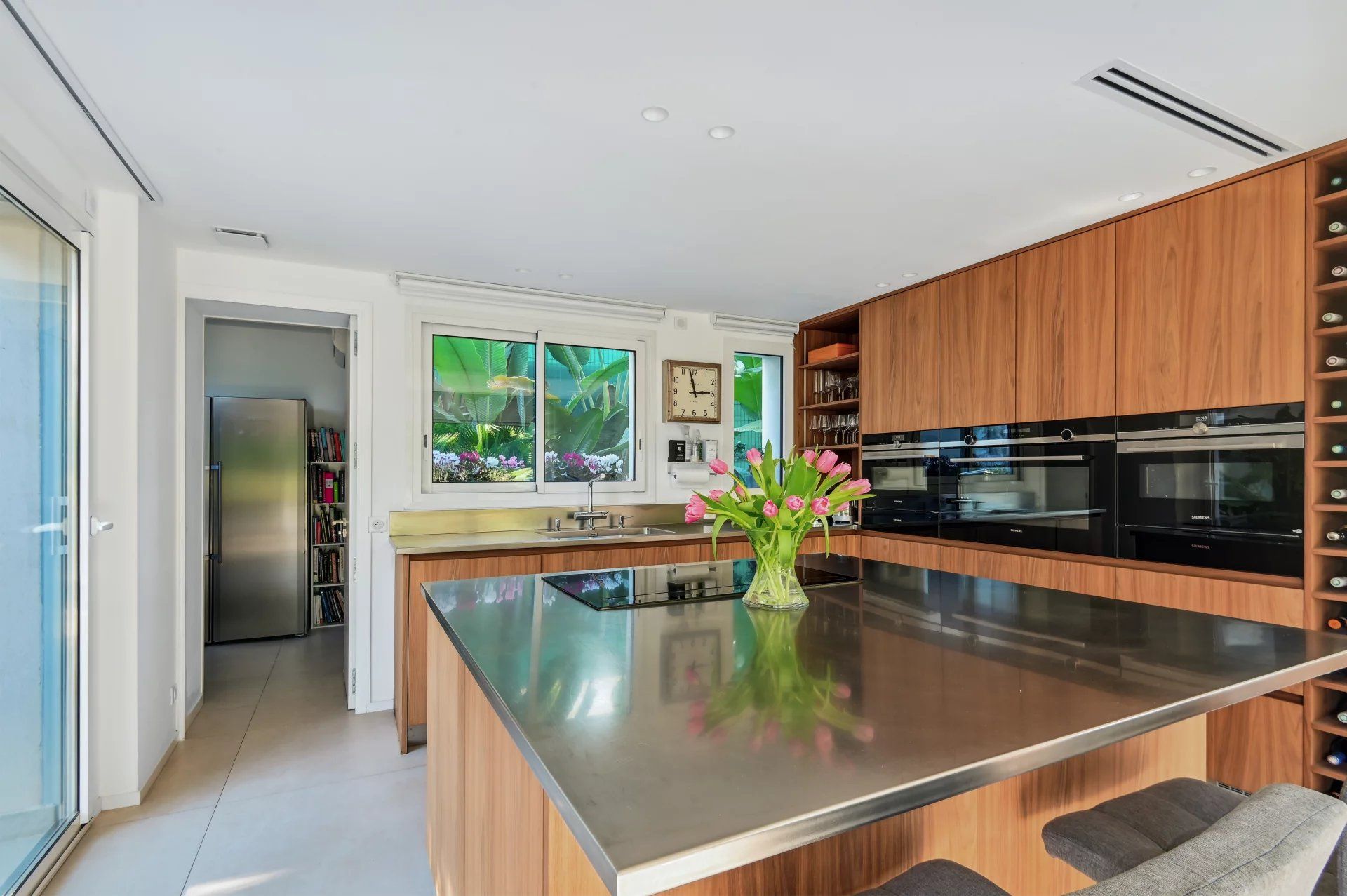 A villa of approximately 270 sq m of living area features on the pool level: an entrance hall, a reception room, a dining room opening onto a terrace, a fully fitted kitchen, a pantry and a guest cloakroom.