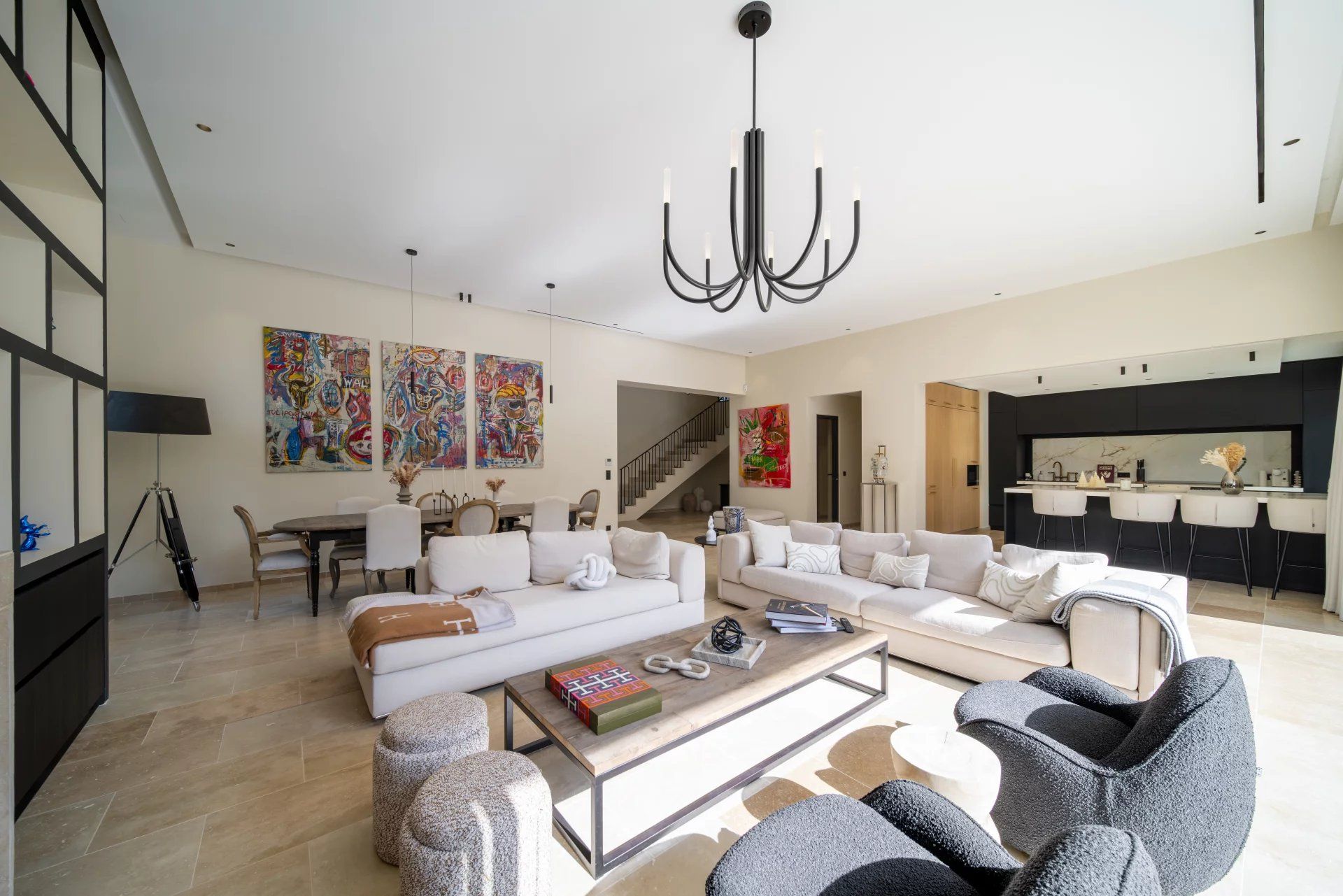 Providing approximately 300 sq m of living area, the villa features on the ground floor: an entrance hall, a spacious reception room with dining area, opening onto a vast terrace and the swimming pool, a fully equipped kitchen, a guest cloakroom, a wine cellar and a laundry.