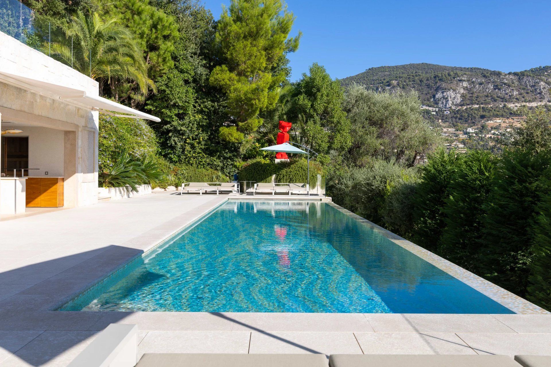 The spacious reception room seamlessly connects to a beautifully landscaped terrace featuring a heated swimming pool and a stylish pool house with a barbecue, sauna, and shower. A stone Jacuzzi provides a serene spot to unwind while enjoying views of Beaulieu and Cap Ferrat.