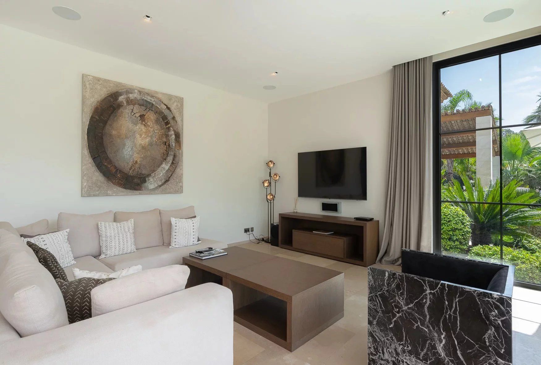 The villa opens onto a superb flat, landscaped garden with views of the surrounding hills. Large sliding glass doors blur the boundary between indoors and outdoors, creating an indoor-outdoor living space bathed in natural light.