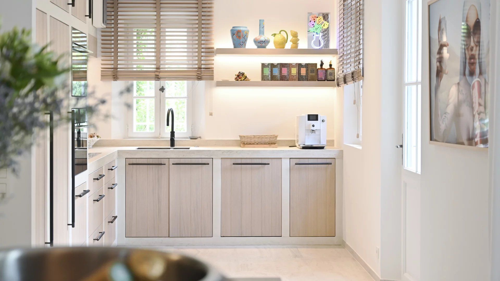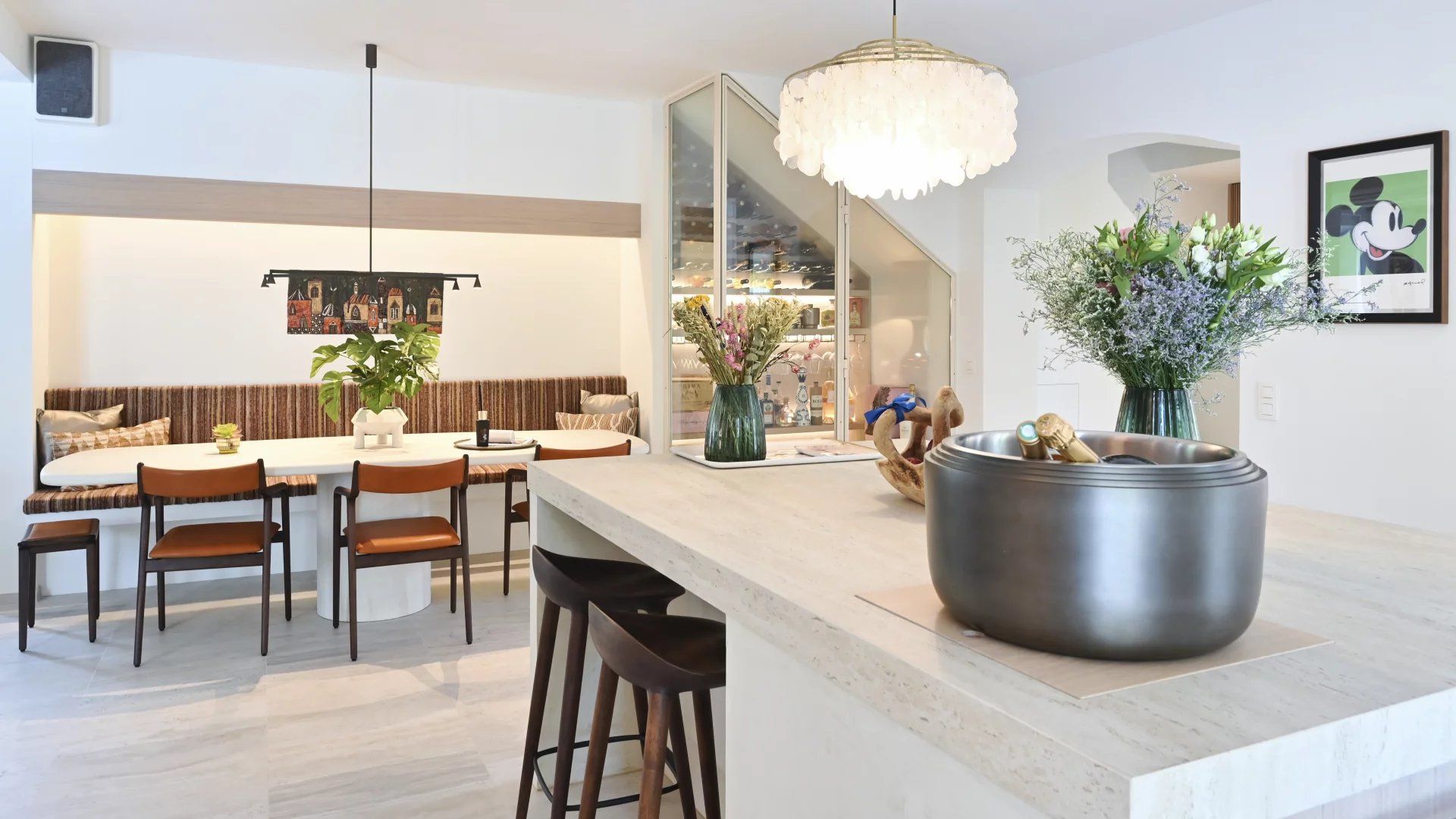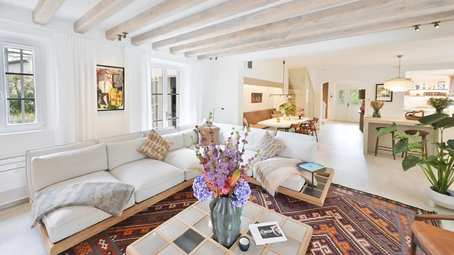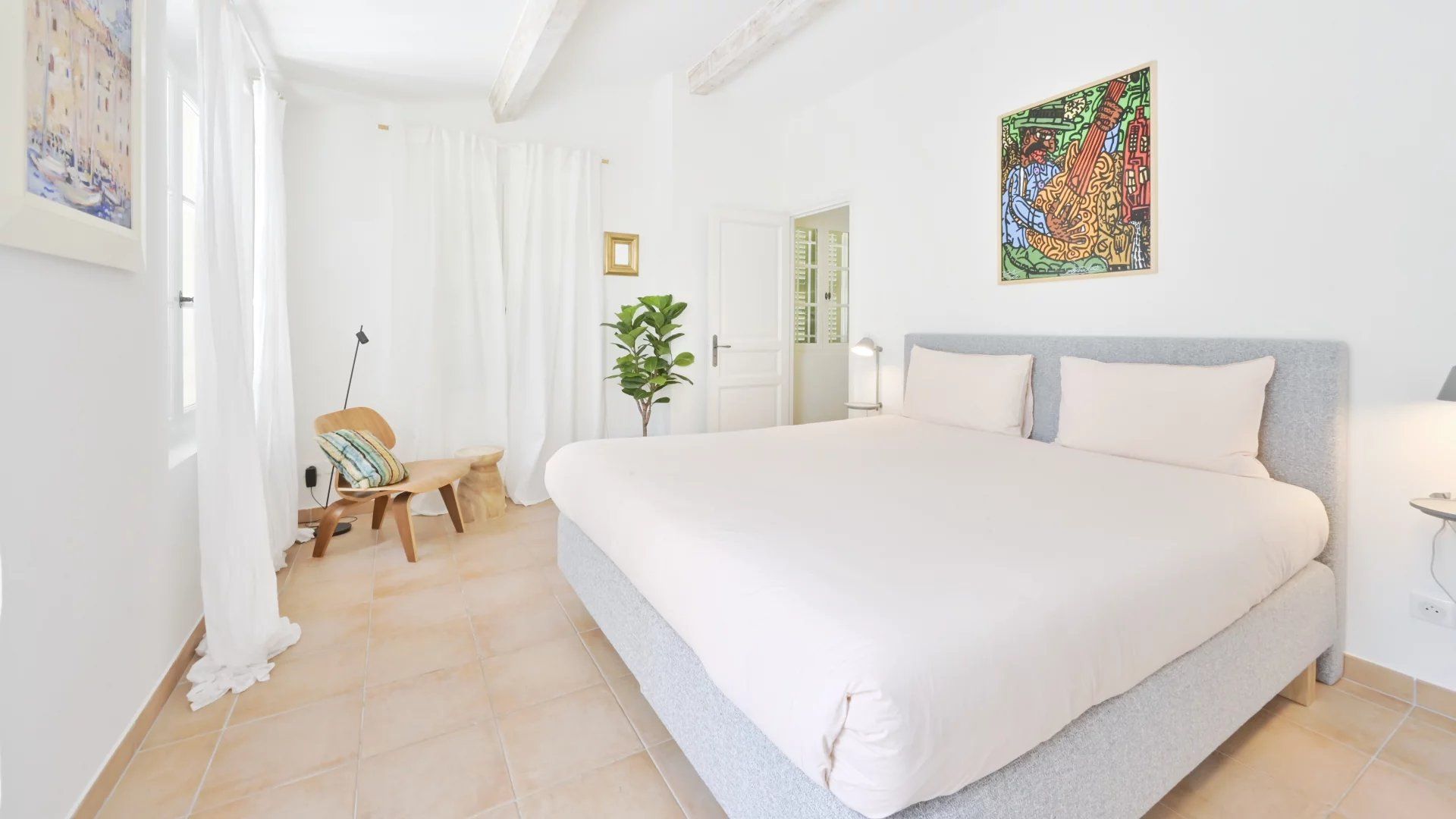 The villa comprises an entrance hall, guest toilet, laundry room and a wine cellar subtly integrated under the staircase. The reception room, dining room and fully equipped open kitchen open onto numerous outdoor terraces, one of which is covered and includes a dining area and a bioclimatic pergola housing a sitting area and a véranda overlooking the pool. These spaces invite you to relax with their dining areas, garden furniture and outdoor kitchen featuring a Weber gas barbecue.