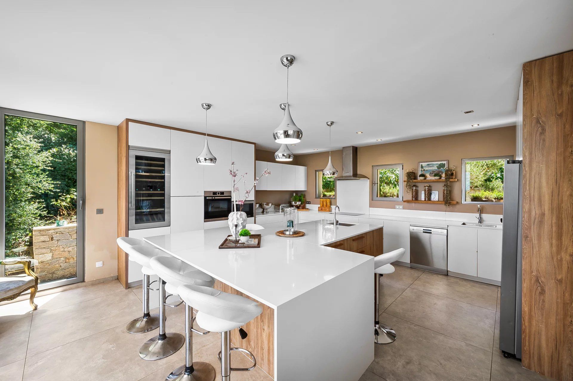 On the garden level, the villa has four en-suite bedrooms, each with direct access to the outdoors, a lounge area, plus a laundry room and a gym.