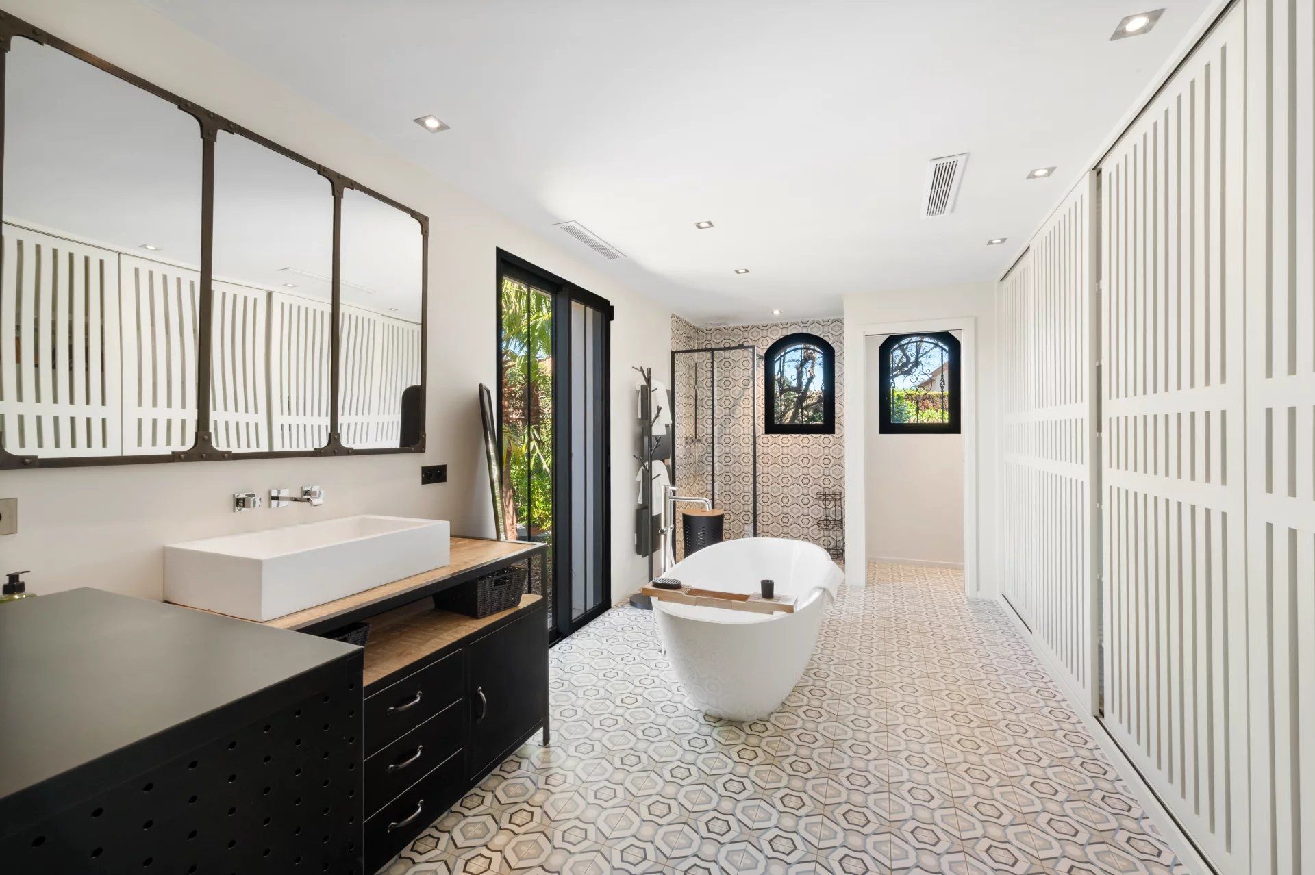 At night, the villa has six bedrooms, spread over two levels, including a staff bedroom. The master suite, with full bathroom, toilet and private terrace, offers remarkable comfort. Two further en suite bedrooms, also on the ground floor, each have their own shower room and toilet. Upstairs, two further bedrooms complete the sleeping area: one with a shower room, the other with a bathroom, each with its own toilet.