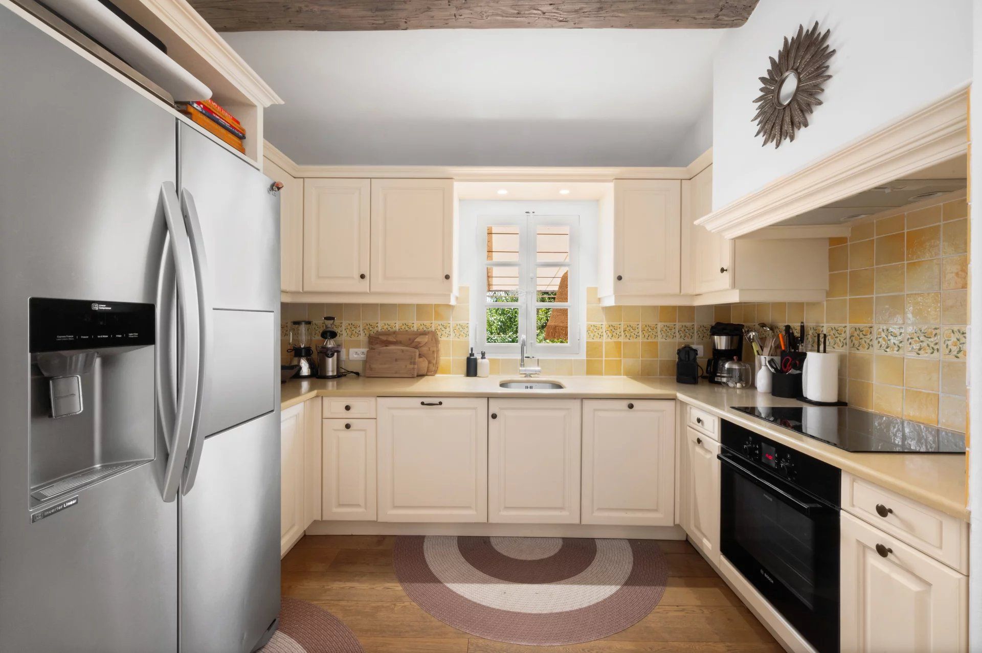The fully air-conditioned villa features a cosy reception room with beamed ceilings, TV lounge and fireplace, and a designer dining room opening onto the terrace and garden. A fully-equipped separate kitchen: oven, induction hob, American fridge, dishwasher, microwave, juicer, Nespresso coffee maker... and a guest toilet at the entrance.