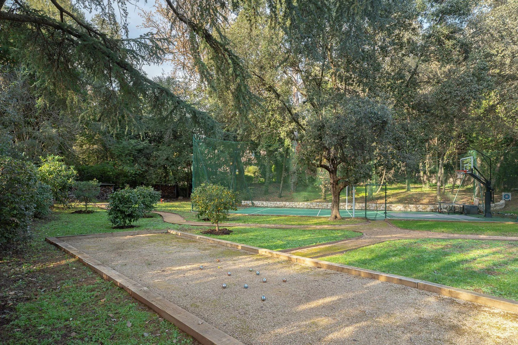 Outside, the inviting pool house features a summer kitchen and studio, accommodating an additional 2 guests. The beautifully landscaped 4500 sqm garden offers a heated swimming pool, pétanque pitch, multisport court, ping-pong table, and an array of sports equipment, ensuring endless entertainment.