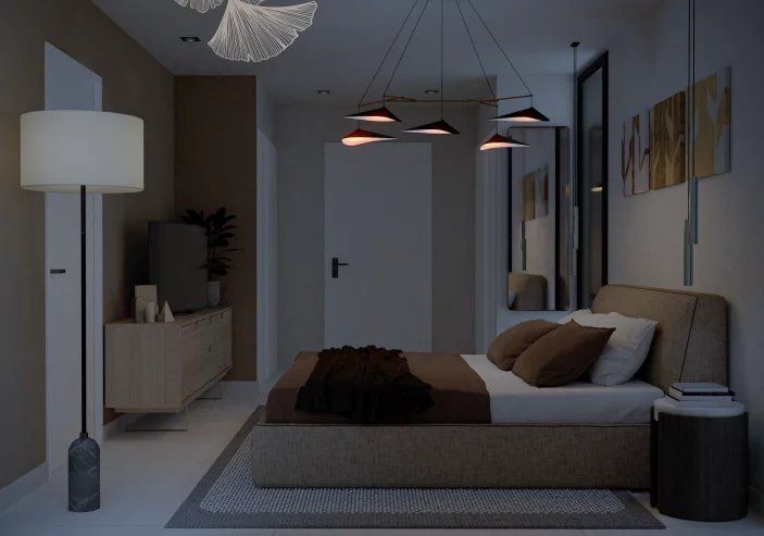 The villa is spread over three levels. On the ground floor, a spacious living area with an open-plan kitchen and dining space opens onto a 35 sq m terrace and a landscaped garden with a swimming pool. A main suite with built-in storage features its own bathroom with a WC. Two additional bedrooms, also with built-in wardrobes, each have their own en suite shower rooms. A guest WC completes this level.