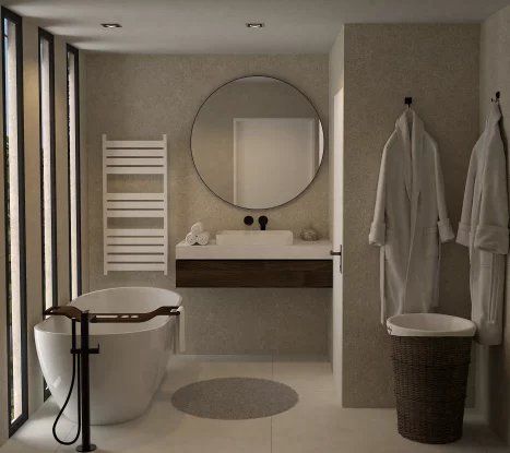 Upstairs, a large primary bedroom with a cathedral ceiling provides an intimate space with an en suite bathroom. A 8 sq m mezzanine can be used as an office or relaxation area.