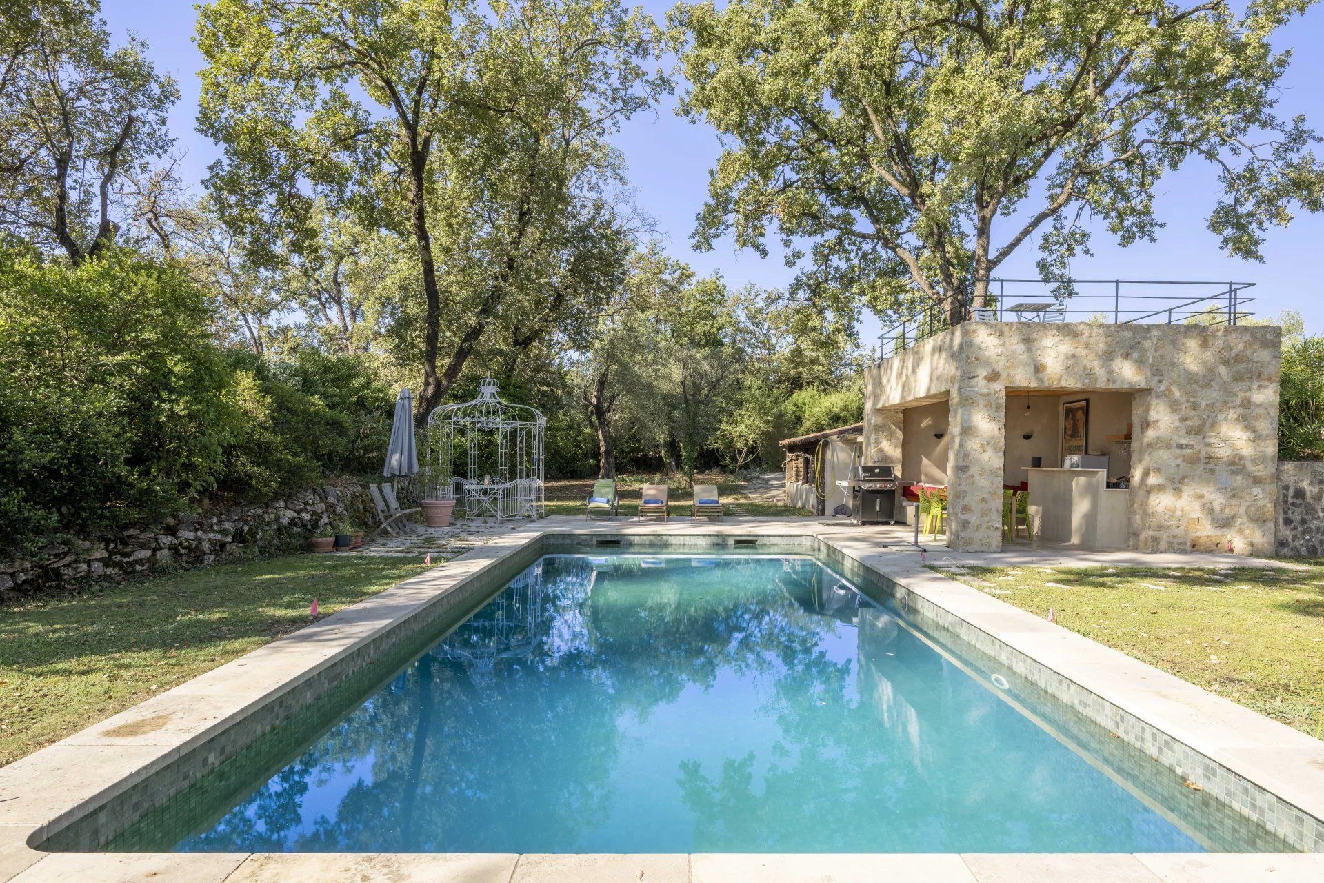 It is complemented by a superb pool house with a summer kitchen and a rooftop solarium. Behind the pool, a stone mazet of approximately 15 sq m, with WC and hand basin, can serve as a home office or storage for leisure equipment.