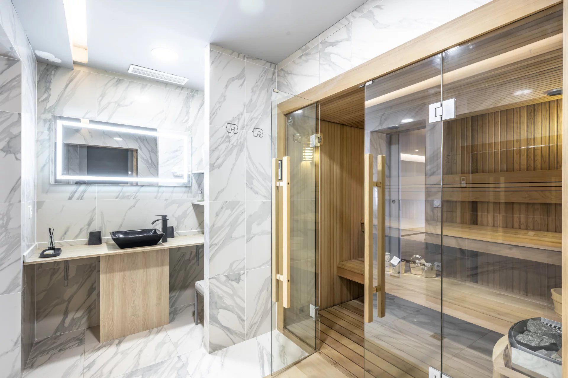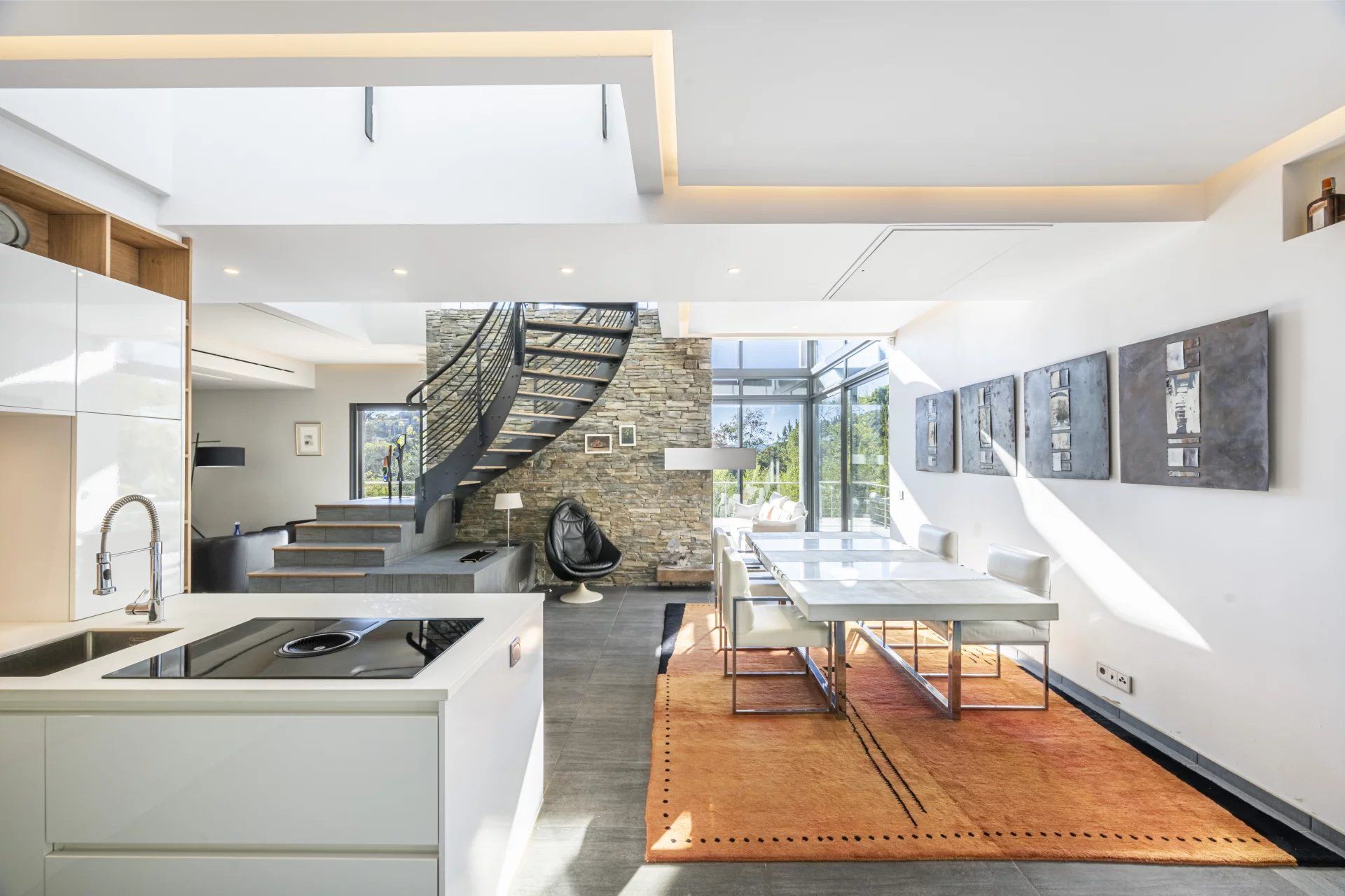 Spread across three levels totalling 500 sq m, the residence immediately captivates with its generous living space, clean lines, and exceptional brightness, thanks to large bay windows that flood the space with natural light. The spacious reception room, extended by a modern and functional open-plan kitchen, creates a convivial and welcoming atmosphere, ideal for entertaining. The 133 sq m terrace with a Jacuzzi, provides an outstanding outdoor space, perfect for moments of relaxation while enjoying a unique panorama.
