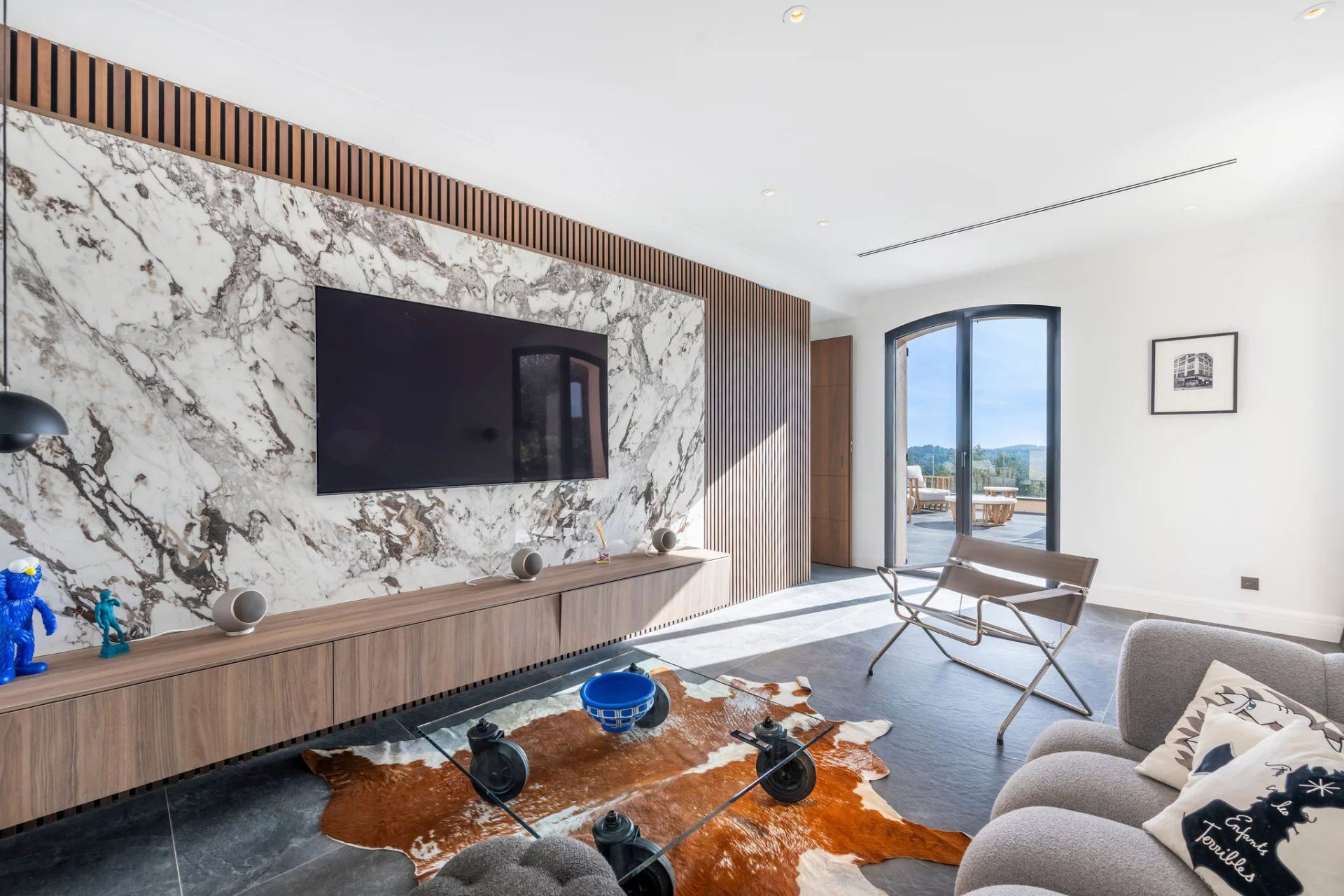 From the moment you enter, you are struck by the harmony of the volumes and the fluidity of the spaces. The bright and welcoming hall opens onto a vast reception room where natural light floods in through large south‑facing French windows. This centerpiece, extended by a sun‑drenched terrace, invites conviviality. The bespoke kitchen, conceived as a true design showcase, blends seamlessly with the dining area, creating a living space that is both functional and aesthetically pleasing. A second, more intimate lounge offers a warm cocoon, ideal for movie nights or family relaxation.
