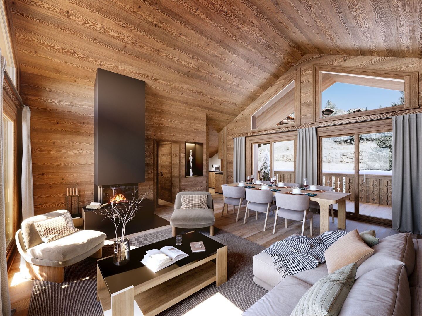 Son architecture reprend les codes emblématiques de Méribel, mêlant bois, pierre et ardoise, pour une intégration naturelle dans le paysage alpin. Les larges ouvertures prolongent les espaces de vie et offrent des vues dégagées sur les sommets environnants.