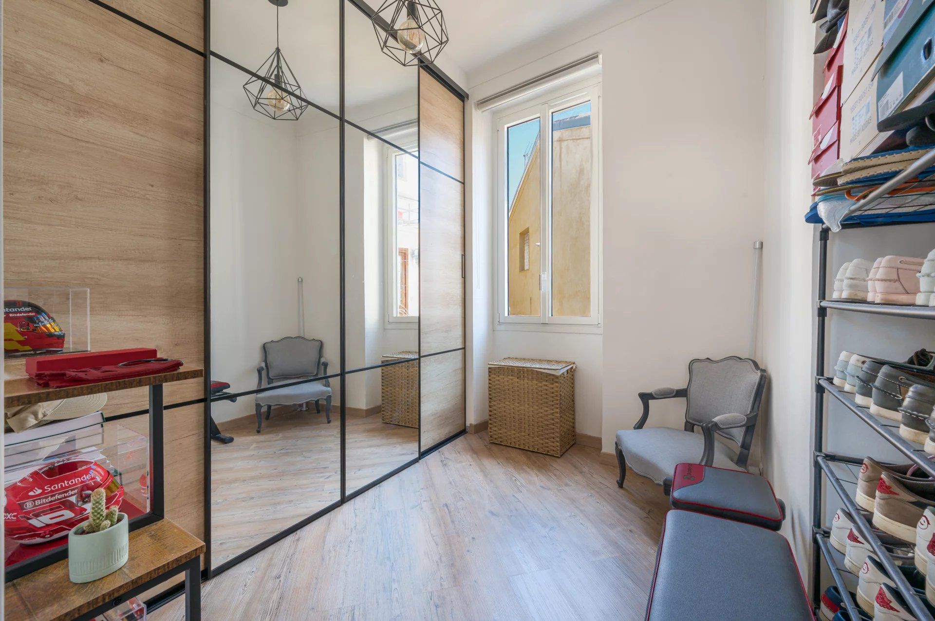 L'appartement se compose d'un spacieux séjour, d'une chambre confortable et d’une pièce supplémentaire avec fenêtre, actuellement aménagée en dressing, mais facilement transformable en bureau ou seconde chambre. La cuisine moderne, entièrement équipée, s’ouvre sur un balcon intime donnant sur une cour intérieure apaisante. La salle d’eau, avec WC séparés, ajoute une touche pratique à cet espace.