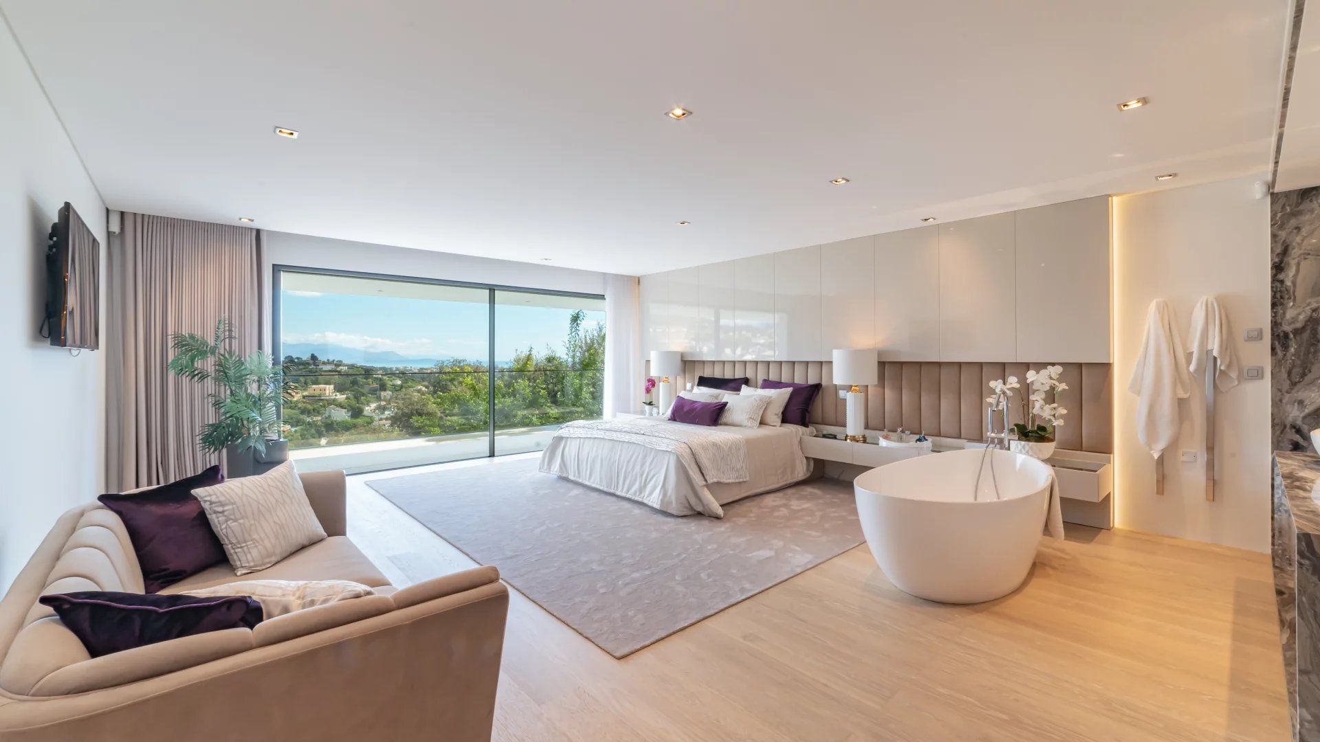Avec plus de 100 m² d'espace salon-salle à manger-cuisine, de plain-pied avec la piscine, cette villa propose un espace de vie généreux, ouvert sur une terrasse de 110 m² au bord de la piscine, offrant une vue féerique sur la mer et les collines, s'étendant jusqu'aux frontières italiennes.