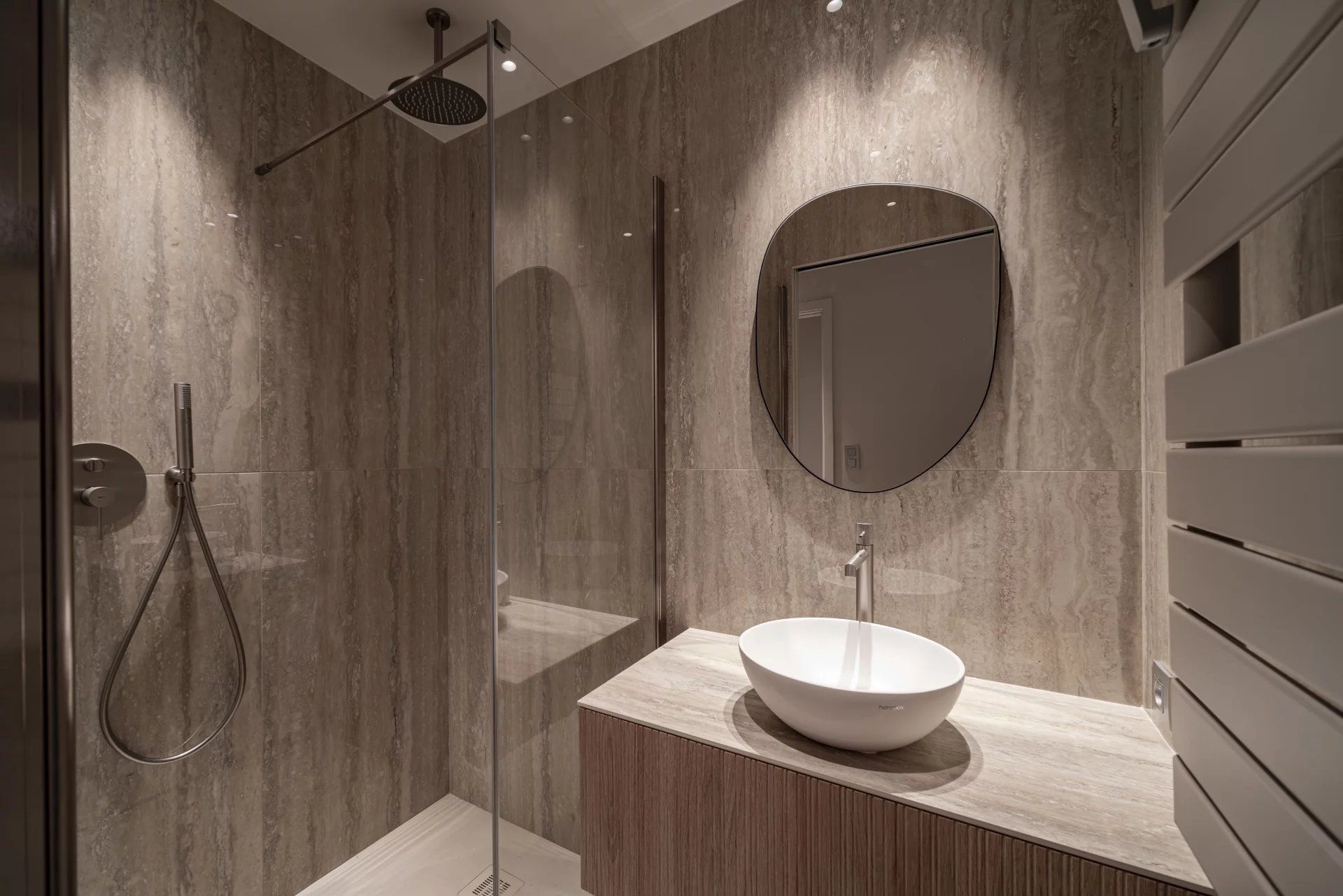 L'appartement d'environ 80 m² habitables se composé d'une entrée, d'un spacieux séjour avec cuisine ouverte, d'un WC invités et de deux chambres en suite avec chacune sa salle de douches et dressing.
