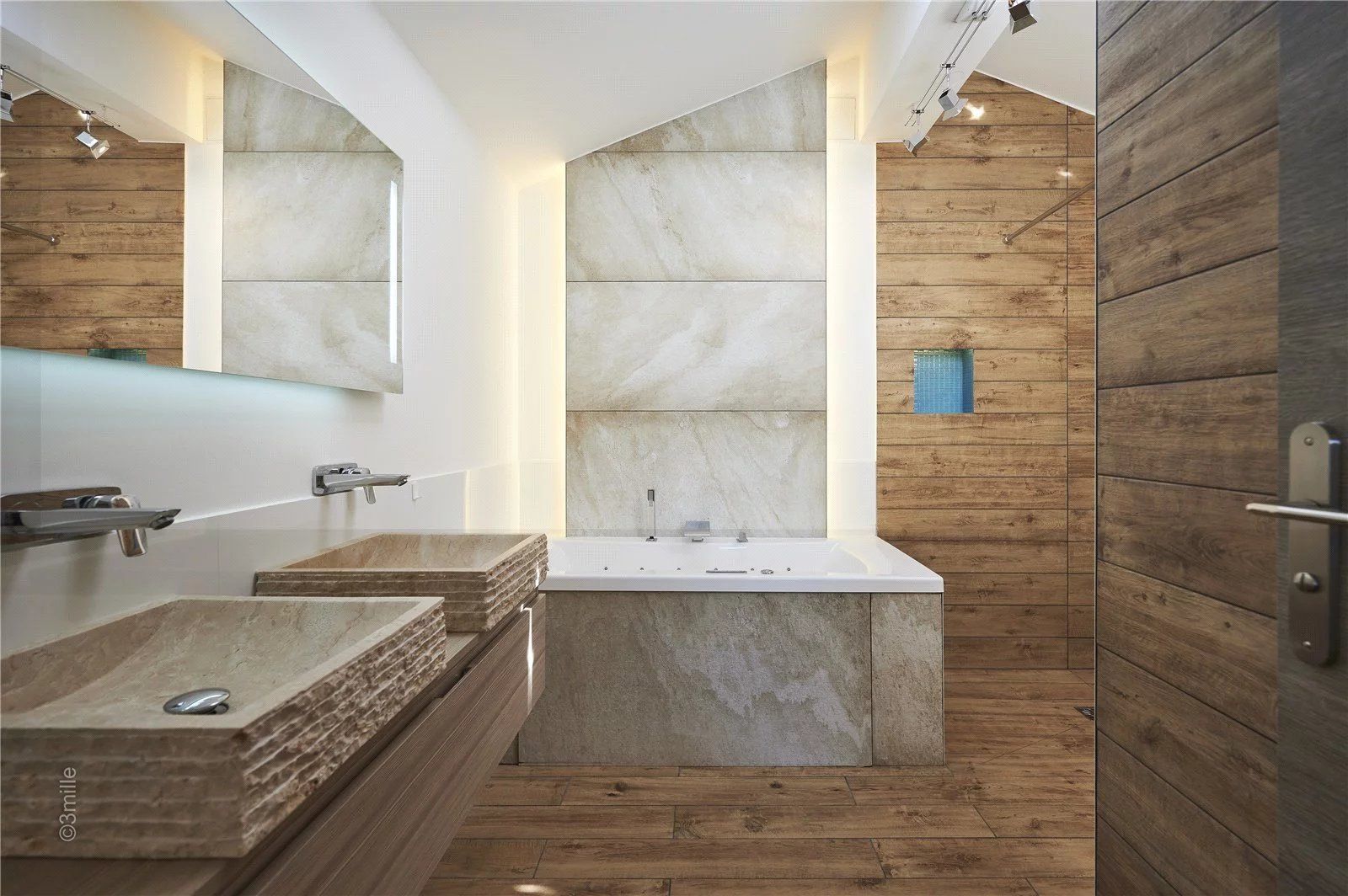 Le premier étage accueille deux chambres avec salles de bains attenantes et la troisième chambre avec salle de douches en suite.