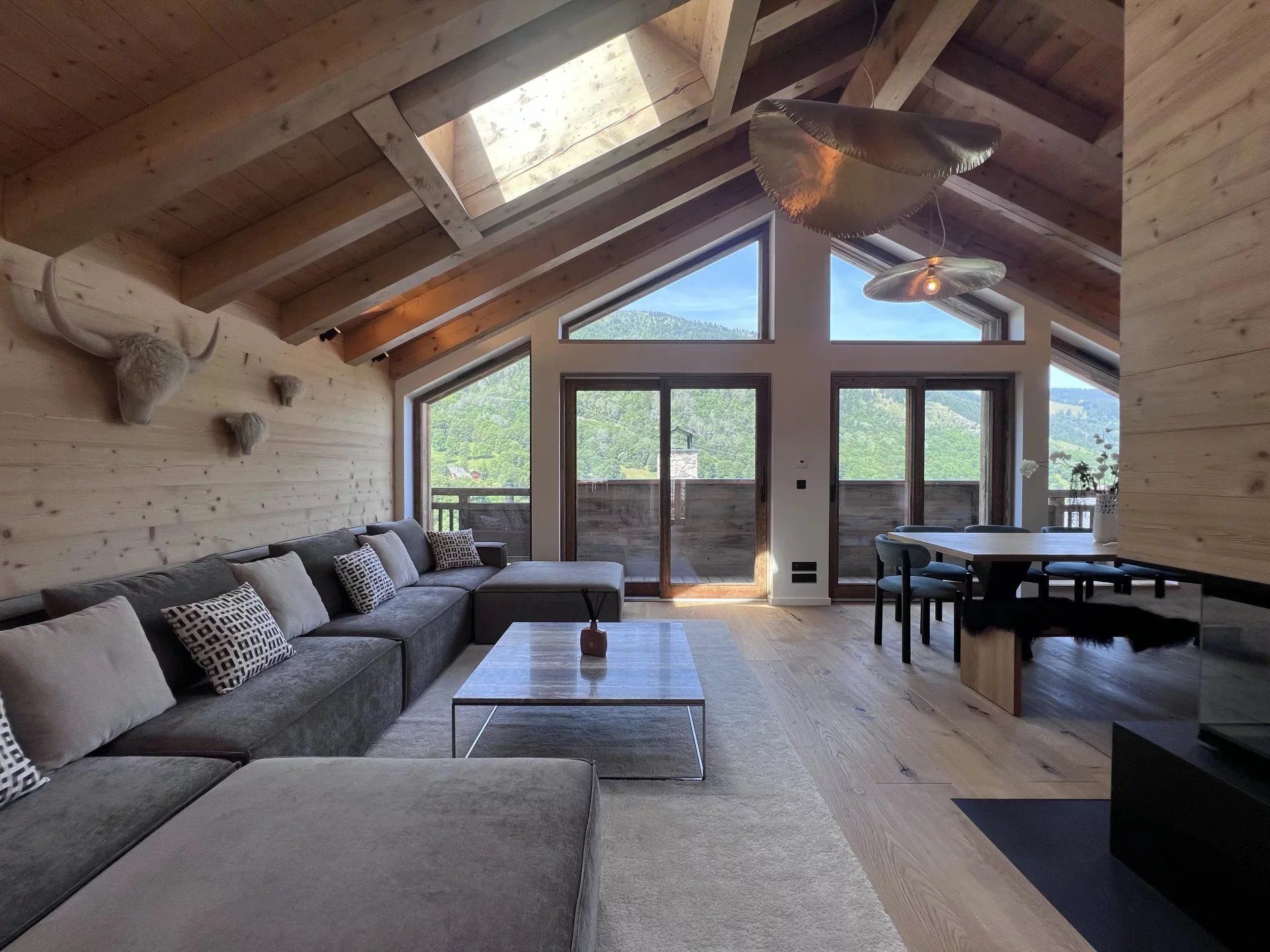 Réparti sur cinq niveaux, ce chalet d'environ 204 m² se distingue par son espace de vie au dernier étage, comprenant un séjour spacieux, un coin repas ouvert sur une cuisine moderne, et un accès à un grand balcon.
