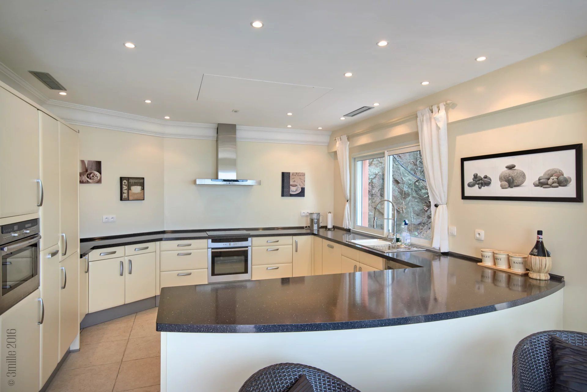 Implantée sur un terrain magnifiquement aménagé d’environ 5500 m², la villa bénéficie de vues époustouflantes sur la mer et le littoral de la Côte d'Azur. L'intérieur lumineux et accueillant s'étend sur deux niveaux et comprend trois chambres spacieuses, chacune avec sa propre salle de bains moderne.