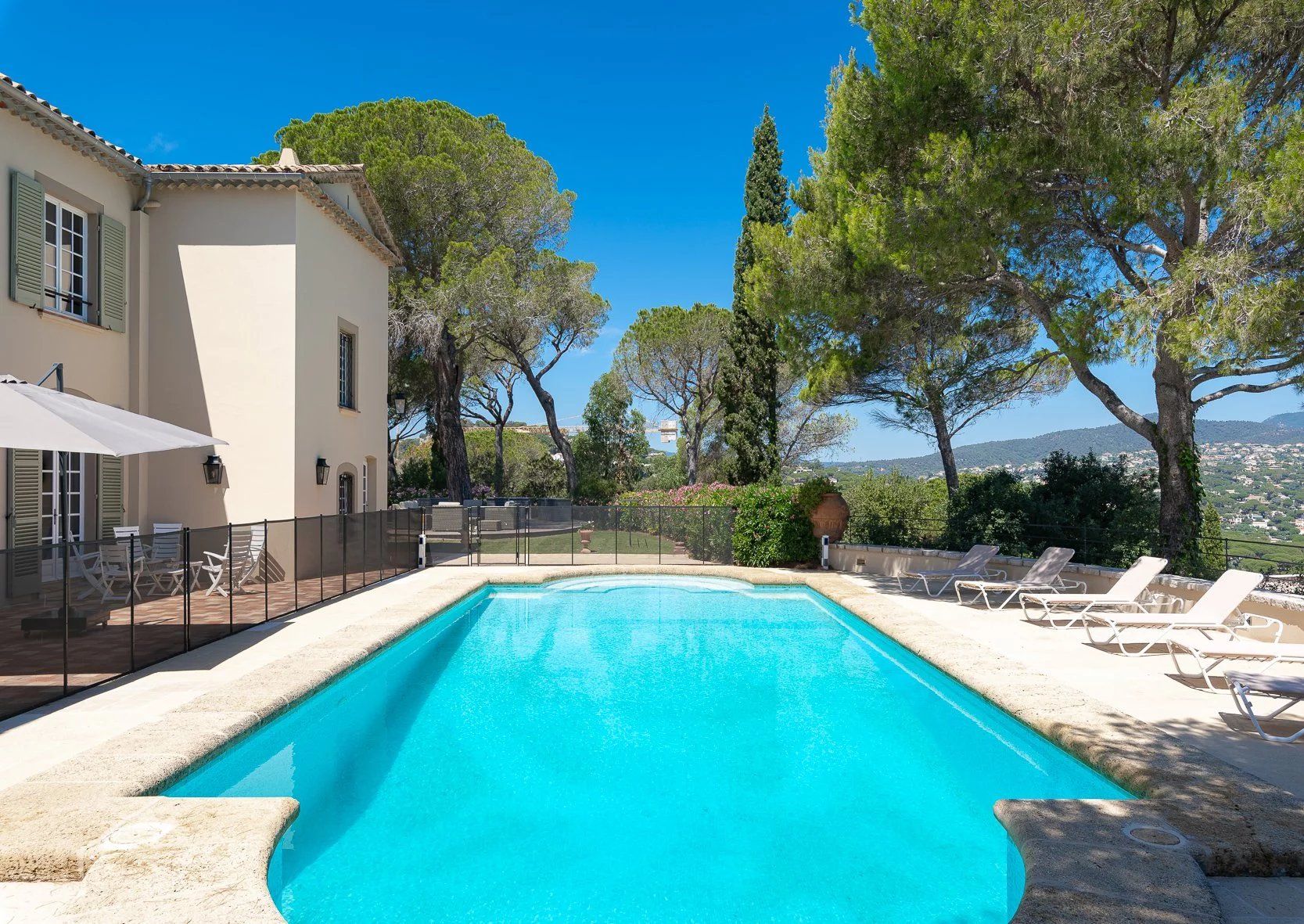 Cette sublime propriété, imprégnée du charme méditerranéen, est nichée sur les hauteurs d'une colline, offrant une vue imprenable sur le Golfe de Saint-Tropez.