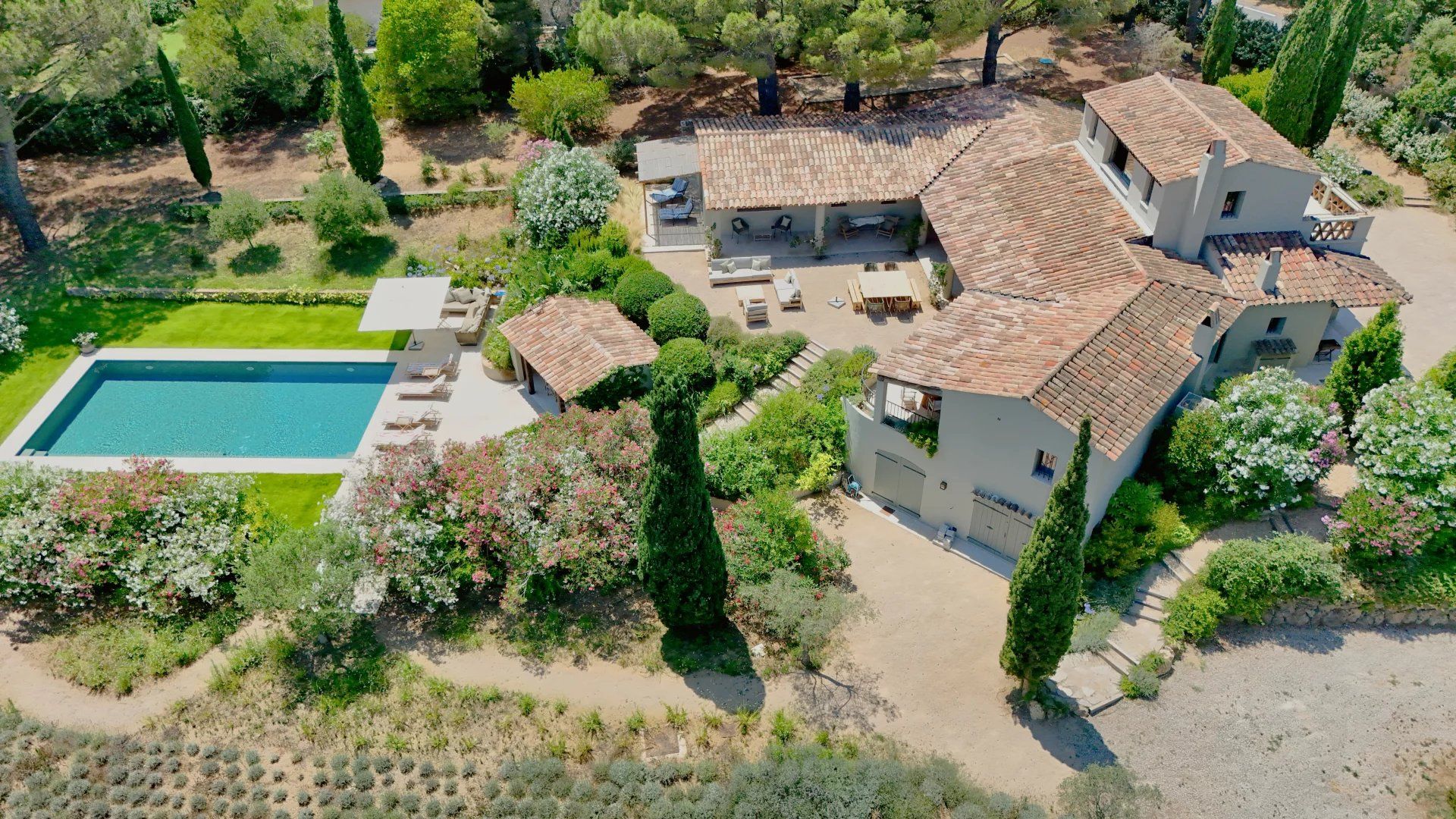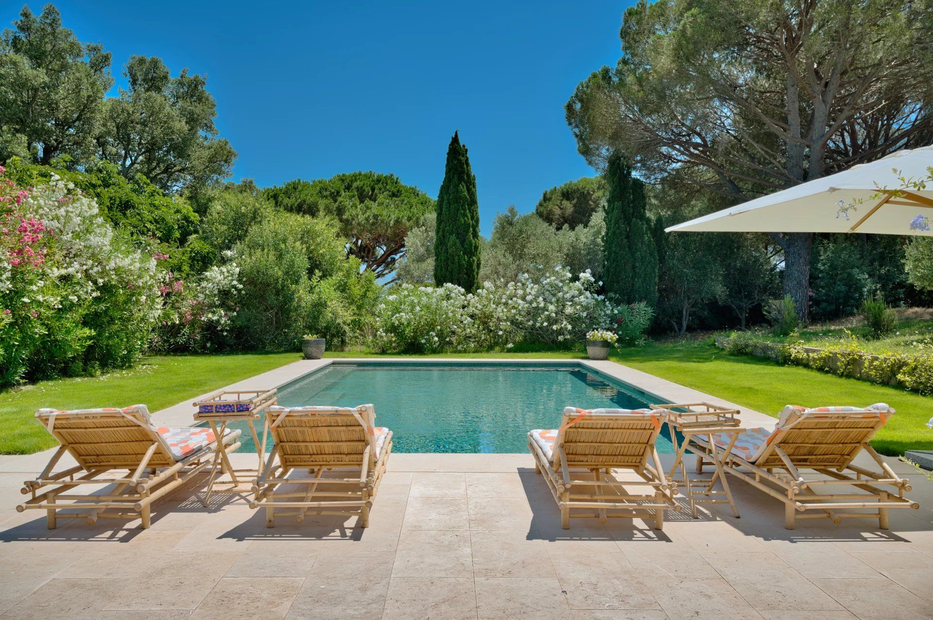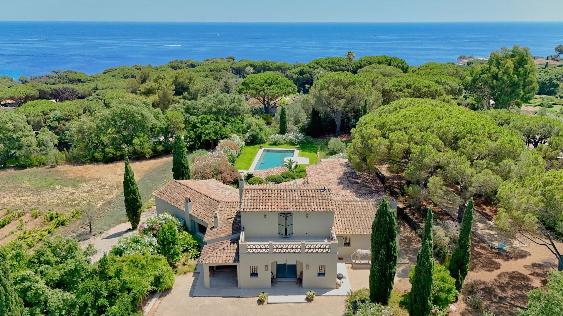 Luxueusement aménagée, dans un esprit résolument Tropézien, intégrée dans la nature, à seulement 10 minutes de la mer, à proximité des plages de Pampelonne et de l’Escalet et édifiée sur un ravissant terrain complanté de vignes et de lavandes, qui s’étend sur 6.760 m².