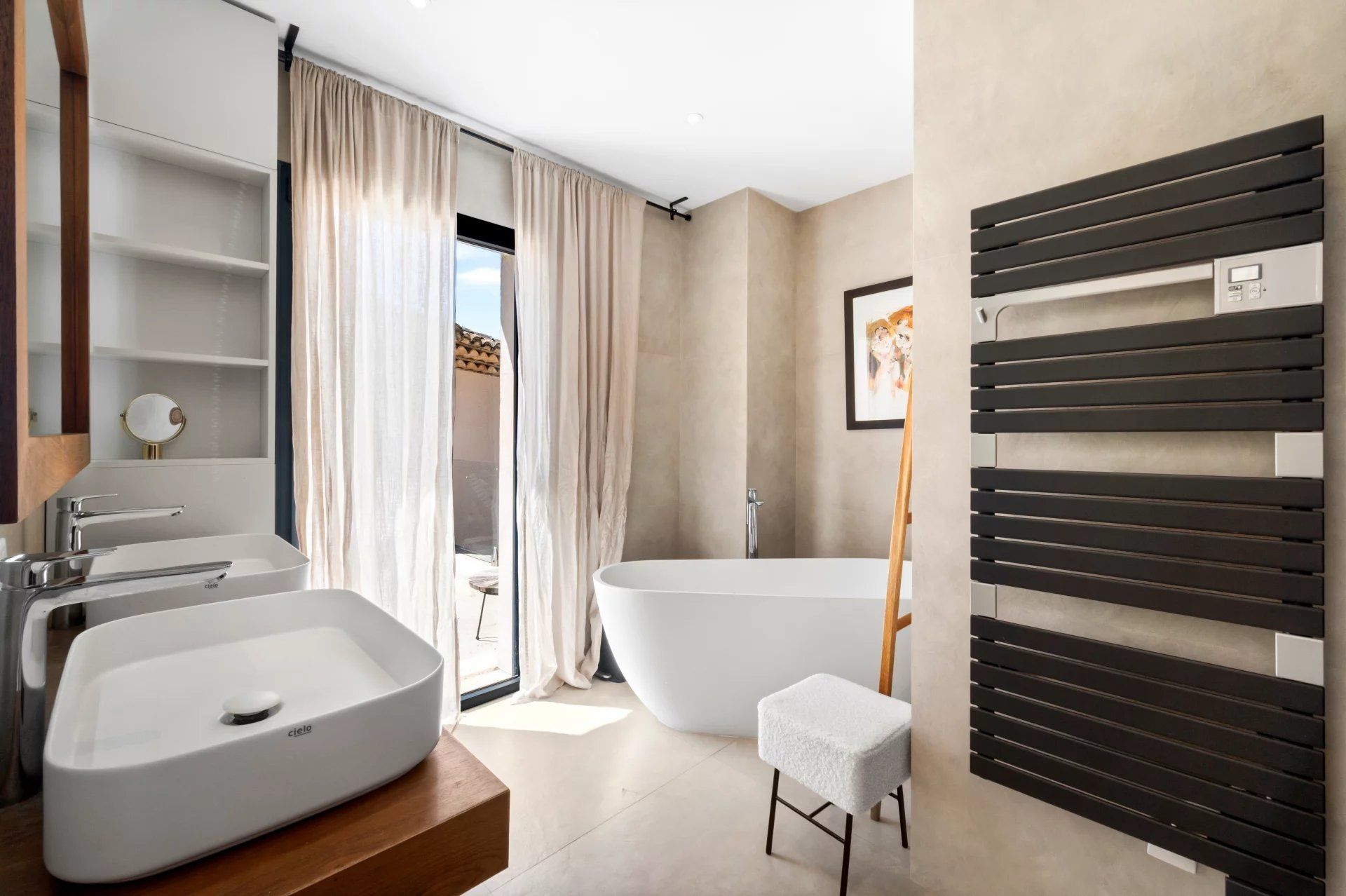 Un second escalier mène à la troisième chambre, qui dispose d'une terrasse privative et d'un lit bébé. La chambre principale, luxueusement aménagée, est équipée d'un lit king-size, de toilettes avec bidet, d'un vaste dressing et d'une salle de bains complète. Elle offre également un accès à une terrasse privative sur le toit avec vue mer.
