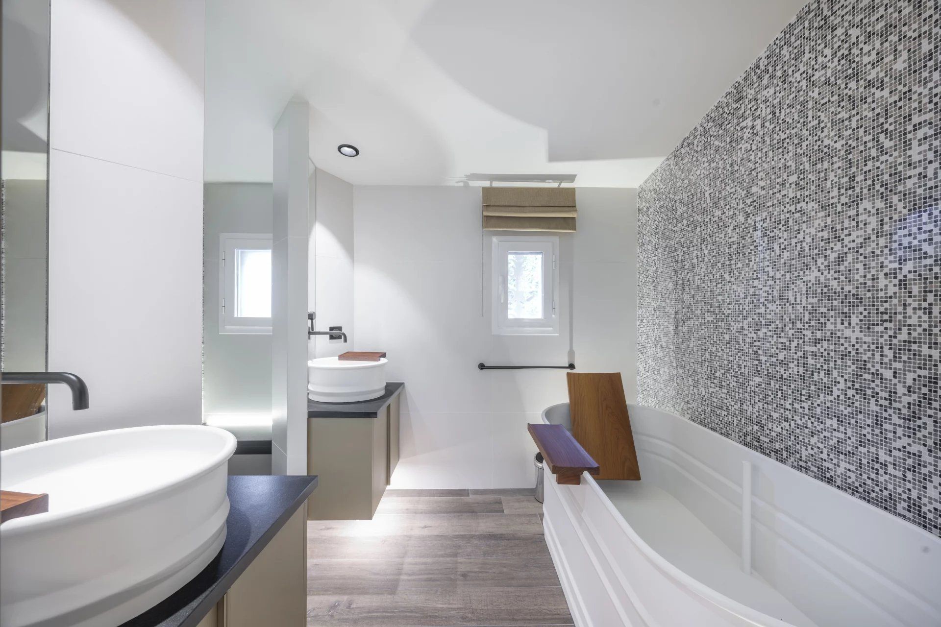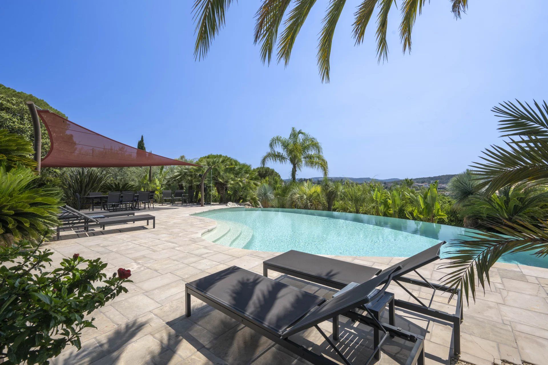 La piscine à débordement, chauffée et traitée au sel, s’intègre harmonieusement aux terrasses couvertes prolongeant le salon, véritable appel à une vie intérieure-extérieure tout en élégance.
