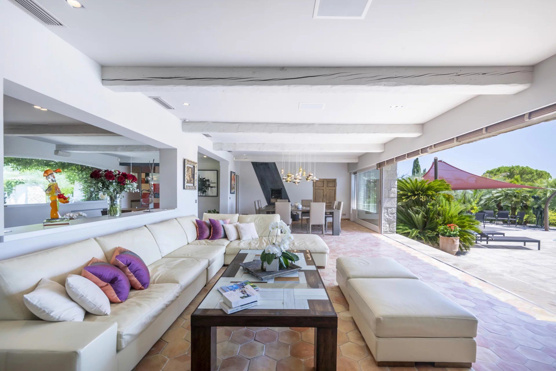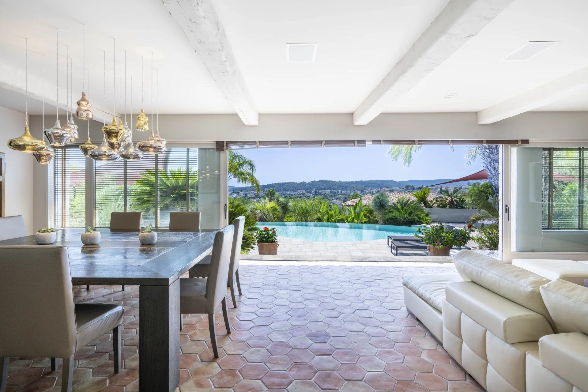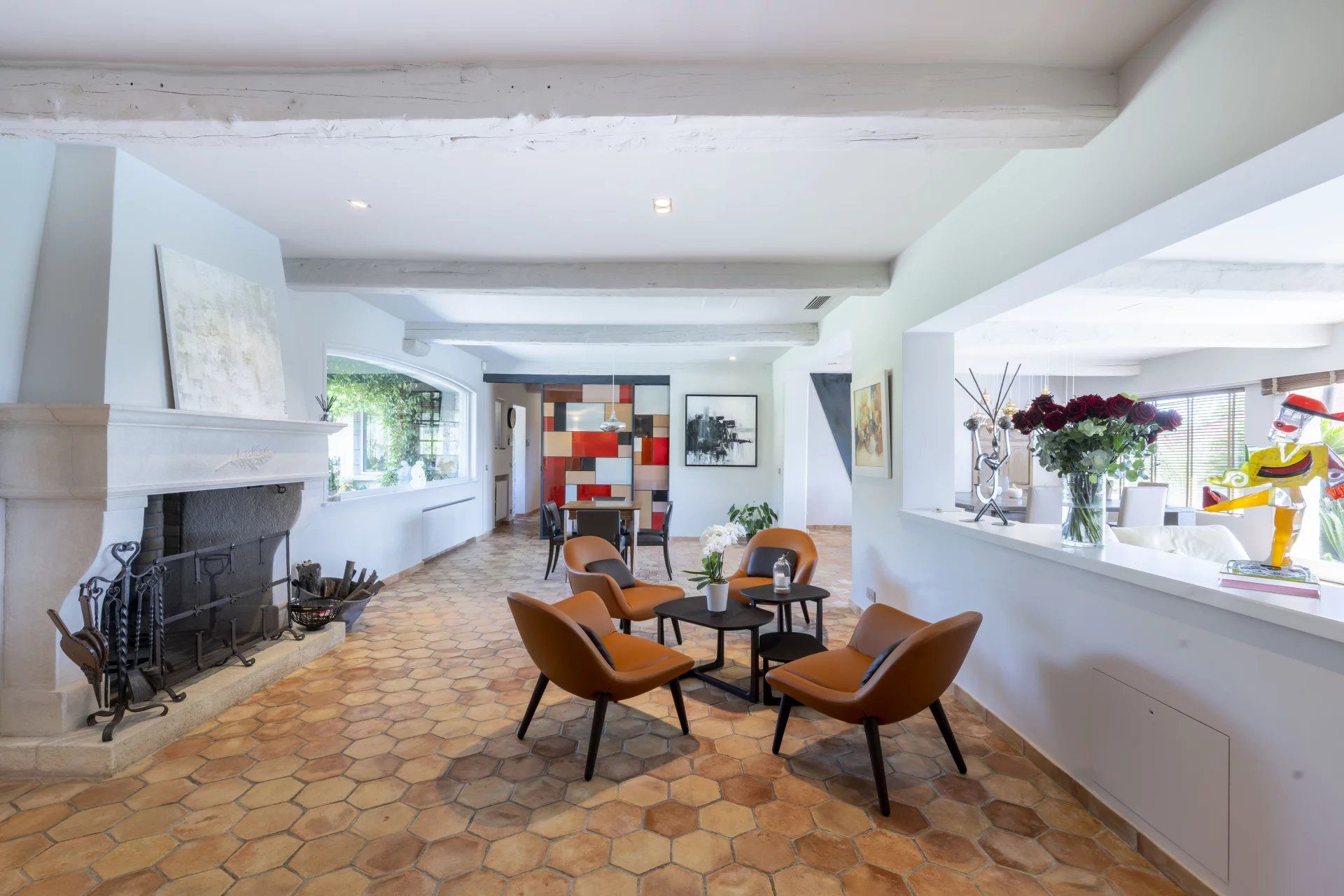 Doté de cheminées, ce vaste séjour prolonge ses volumes vers les terrasses extérieures et la piscine, avec de magnifiques vues sur les villages alentour.